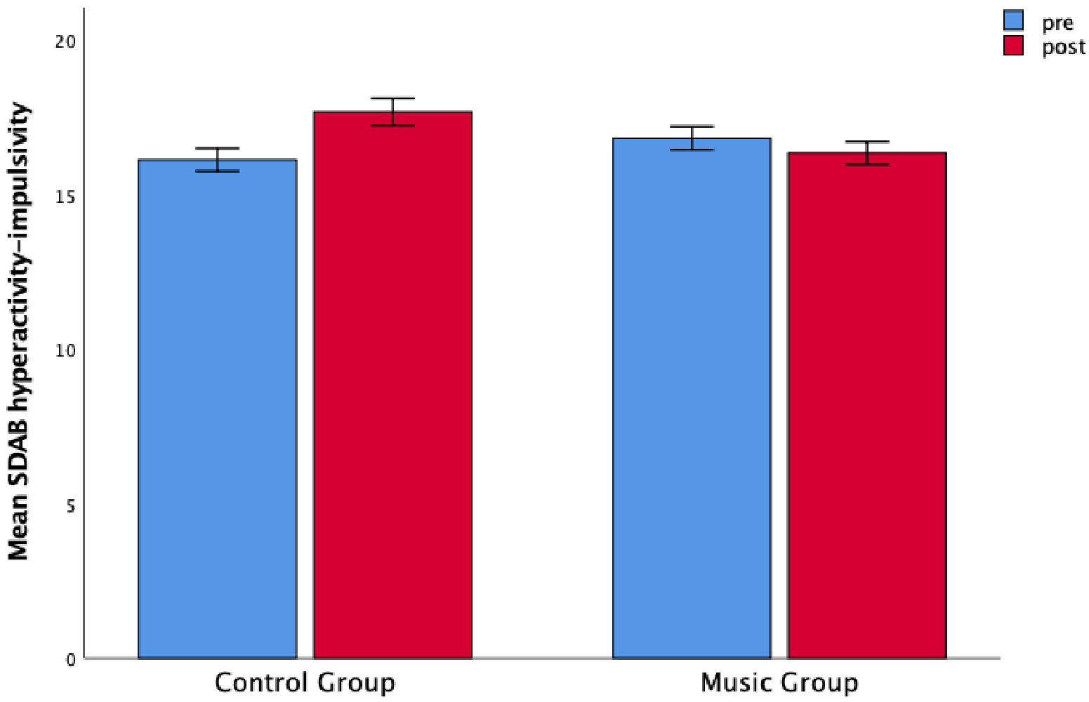 Figure 3. The control group was associated with an increase in hyperactivity scores that was not found in the music group. Children’s mean scores as a function of Time (pre-test and post-test) and Group (music and control). Error bars are standard errors.