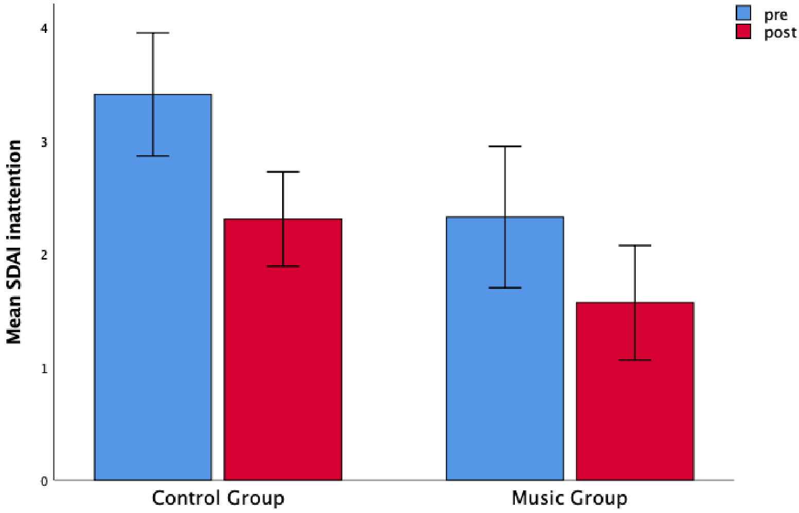 Figure 4. Both the control group and music groups showed a decrease in inattention scores rated by the teachers. Teachers’ mean scores as a function of Time (pre-test and post-test) and Group (music and control). Error bars are standard errors.