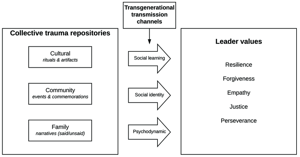 The purpose of this article was to explore how the transmission of collective trauma shapes leader values. We addressed this by underlining the importance of collective trauma and leader values as constructs. We then identified the collective trauma repositories that are key in the memory of descendants as well as the channels through which these repositories are transmitted. We finally proposed a model (Figure 1) that explains how these repositories can shape leader values such as resilience, forgiveness, empathy, justice and perseverance, substantiated with relevant propositions.