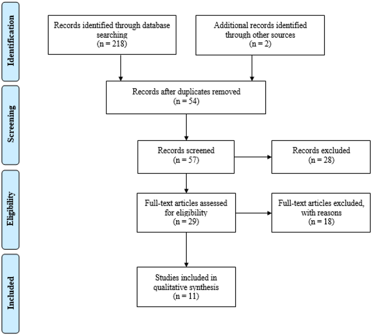 The initial search identified 218 records, as shown in the PRISMA flow diagram (Figure 1). Only 2 records were added from other sources. Among them, 54 duplicates were removed. Thus, 57 records were screened and, among them, 28 were removed for different reasons (e.g., the article was not specifically addressed to NBGQ people, authors did not differ NBGQ from BT participants, the article did not address the health outcomes of medical interventions, etc.). Among 29 full-text articles assessed for eligibility, 11 were evaluated as suitable for the current systematic review. The reasons that lead to exclude the remaining 18 papers were: (1) the research was based on a dataset already considered in another article (n = 1); 2) no research designs were performed (n = 4); (3) the article did not specifically address health outcomes (n = 11); (4) the journal was not peer-reviewed (n = 1), and (5) the identity of participants was not clearly defined (e.g., “other”) (n = 2).