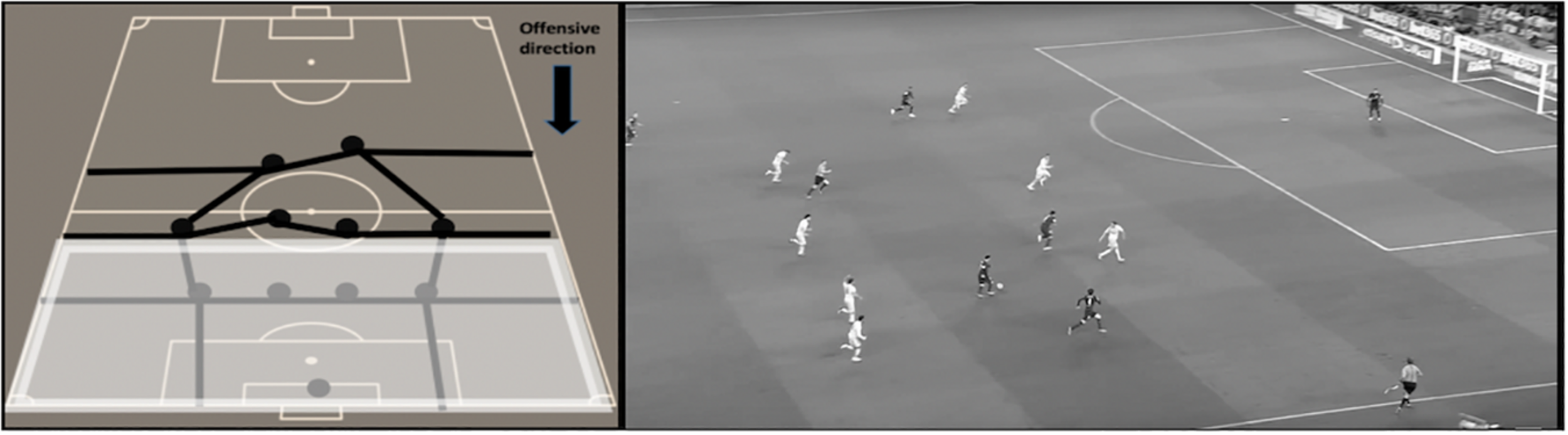 Graphic representation and real example of offensive penetration. The team possession achieves to beat the forward and midfielders’ lines of the opponent and face directly the defensive line during the offensive sequence but the possession ends without creating any scoring opportunity. The player(s) facing the defensive line has/have enough time and space to perform intended actions on the ball at the moment of receiving the ball.
