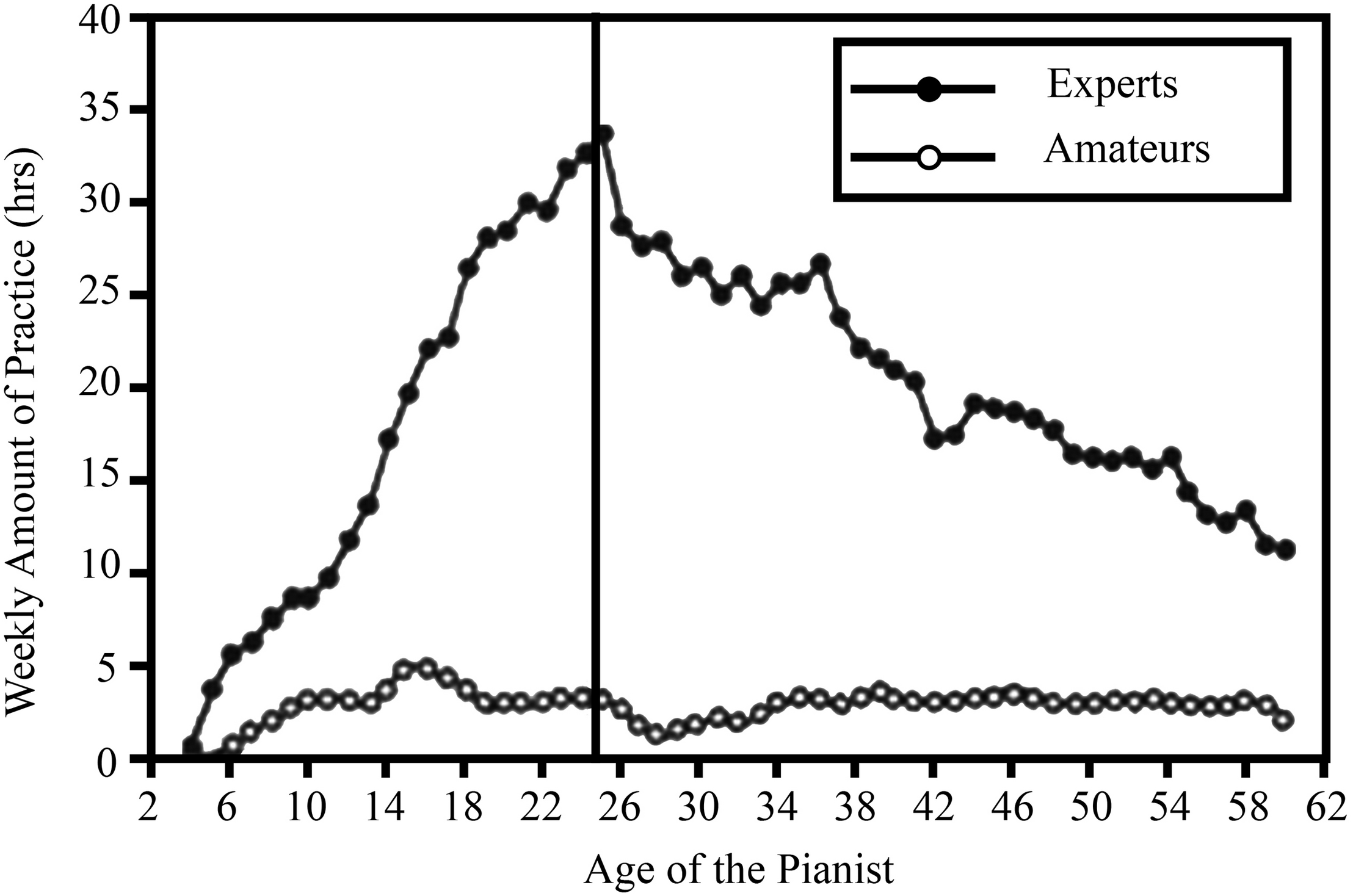 Figure 2. Pianists’ retrospective estimates of their weekly practice as a function of age. Data in the left panel are aggregated for young and older pianists. Data points above the minimum ages (20 for the young pianists and 52 for the older pianists) include at least 50% of the participants in each group (reproduced with permission of Figure 7 in Krampe and Ericsson, 1996).