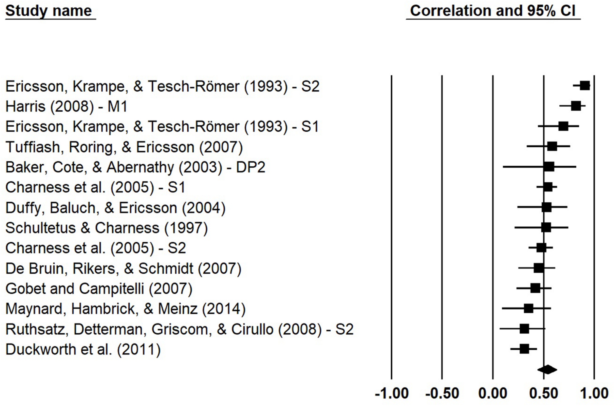 Figure 4. Correlations between purposeful or deliberate practice and performance. Squares represent correlation coefficients for the effects of practice on performance for each listed sample, and lines represent 95% confidence intervals. The marker at the bottom shows the weighted mean correlation. Study naming conventions were kept consistent with those used by Macnamara et al. (2014) for comparison purposes, indicating separate samples (e.g., S1) or measures of practice (e.g., DP2) or performance (e.g., M1).