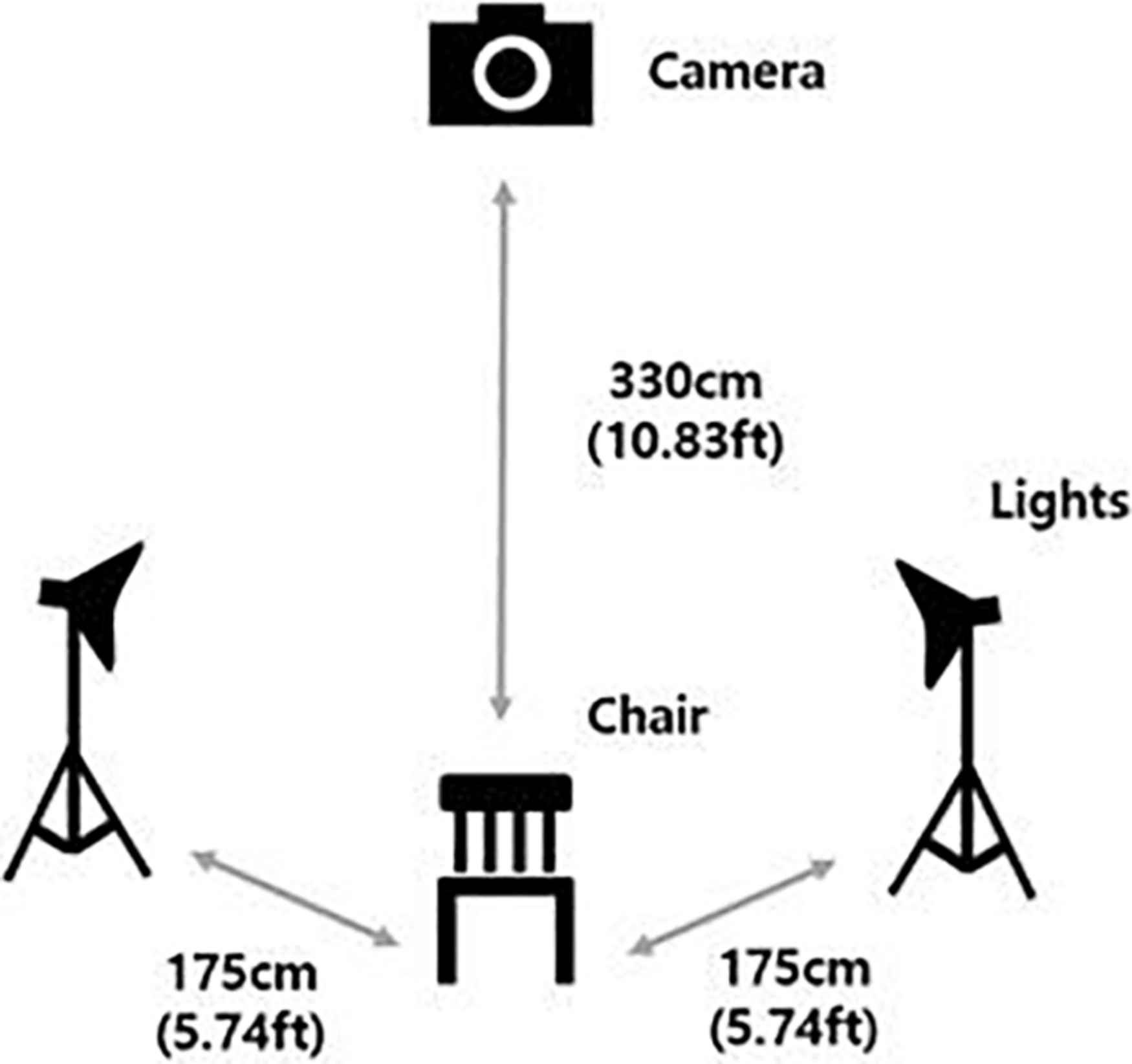 The photo and film shoots took place in a video production room at a university library located in Seoul. The models were instructed to sit in a chair in front of a white background screen. A Canon EOS 5D Mark II camera equipped with a Canon EF 70–200 mm lens was used, along with two PROSPOT DHL-1K standing lights. The distance between the chair and the camera was approximately 330 cm (10.83 ft), and the distance between the chair and the lights were approximately 175 cm (5.74 ft) each. Figure 1 shows the setup of the photo shoot.