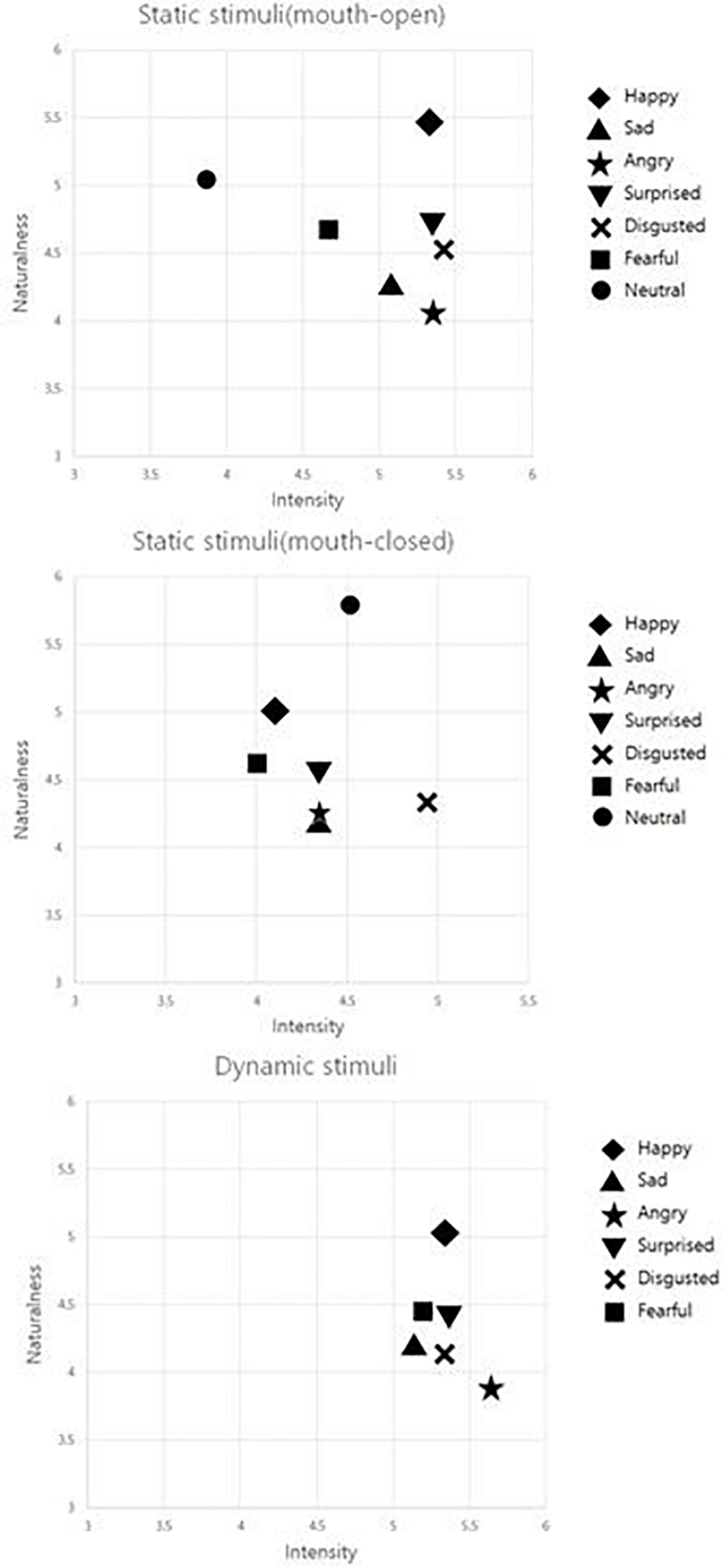 Third, despite the dynamic nature of emotional expressivity and its perception in daily social interactions (Sato and Yoshikawa, 2004; Kamachi et al., 2013), most of the existing databases, especially the Korean databases, consist only of static stimuli, which raises the ecological validity issue (Rhodes et al., 2011; van der Schalk et al., 2011; Kościński, 2013). Indeed, recent studies revealed that study results are affected by the types of stimuli (static or dynamic). For example, some researchers found that facial expressions are perceived more accurately in dynamic than in static stimuli (Ambadar et al., 2005; Trautmann et al., 2009) and that the intensity and naturalness are rated higher in dynamic stimuli (Biele and Grabowska, 2006; Weyers et al., 2006; Cunningham and Wallraven, 2009). Furthermore, raters reported a higher arousal level when presented with dynamic rather than static stimuli (Sato and Yoshikawa, 2007a), and they imitated models’ facial expressions more accurately (Sato and Yoshikawa, 2007b; Sato et al., 2008). In addition, neuroimaging studies have noted that the range of brain neural networks activated when processing dynamic facial expressions is wider than that for static expressions. Thus, a database that subsumes both the static and dynamic stimuli is called for, and, internationally, several facial stimuli databases have been developed to include dynamic stimuli into their databases. Yet, such database that suits Asian population has not been developed.