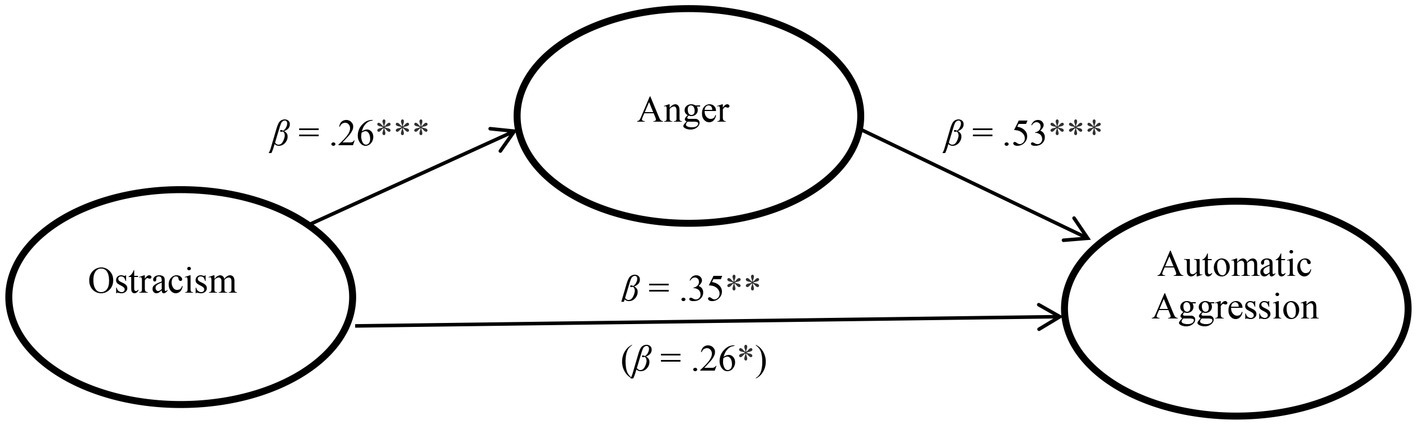 Anger partially mediates the effect of ostracism on automatic aggression in Study 3. Note: *p < 0.05; **p < 0.01; ***p < 0.001.