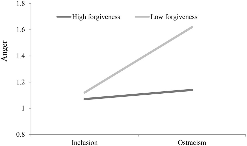 Forgiveness has been conceptualized not only as a specific act but also as a disposition. Individuals with high forgiveness tend to be more likely to forgive others when they are offended or hurt by transgressions (McCullough et al., 2003; Fincham et al., 2006). As a positive personality trait, forgiveness could decrease negative emotions, such as anxiety and depression (Subkoviak et al., 1995; Brown, 2003). As a psychotherapeutic intervention technique, forgiveness frees people from their anger and related negative emotions (Fitzgibbons, 1986). A large number of clinical case studies also showed that a forgiveness intervention was beneficial for individuals. It can decrease anger and lessen anxiety (Fitzgibbons, 1986; Luo and Huang, 2004). Based on this research and theory, we predicted that forgiveness would moderate the link between ostracism and anger: individuals with low forgiveness would have higher levels of anger than individuals with high forgiveness when they are ostracized by others.