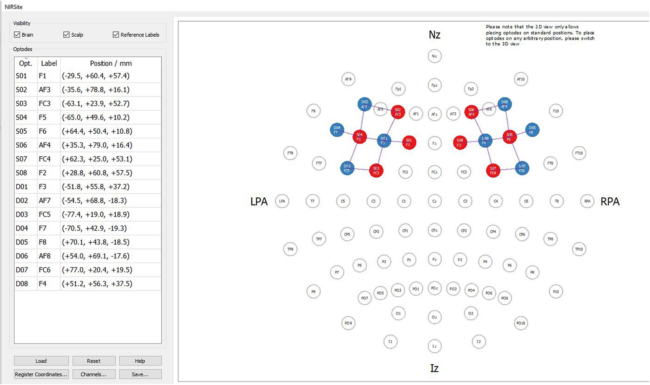 In order to measure changes in cerebral oxygenation this study utilized the NIRSport2 system. (NIRSport2 8-8, NIRx Medical Technologies LLC, United States) which is a portable, wearable, multichannel fNIRS system consisting of 8 LED illumination sources and 8 active detection sensors. Emitters were placed on positions F1, AF3, FC3, F5, F6, AF4, FC4, and F2 while detectors were placed on positions F3, AF7, FC5, F7, F8, AF8, FC6, and F4 (Figure 2). Eighteen channels were set up covering the prefrontal cortex. The source—detector distance was 3 cm. Optodes were placed on the participant’s head using an Easycap relative to the international 10/20 system (Jasper, 1958). The data was acquired with the Aurora 1.4. acquisition Software (v2014 NIRx Medical Technologies LLC) at two near infra-red light wavelengths of 760 and 850 nm, with a sampling rate of 7.81 Hz.