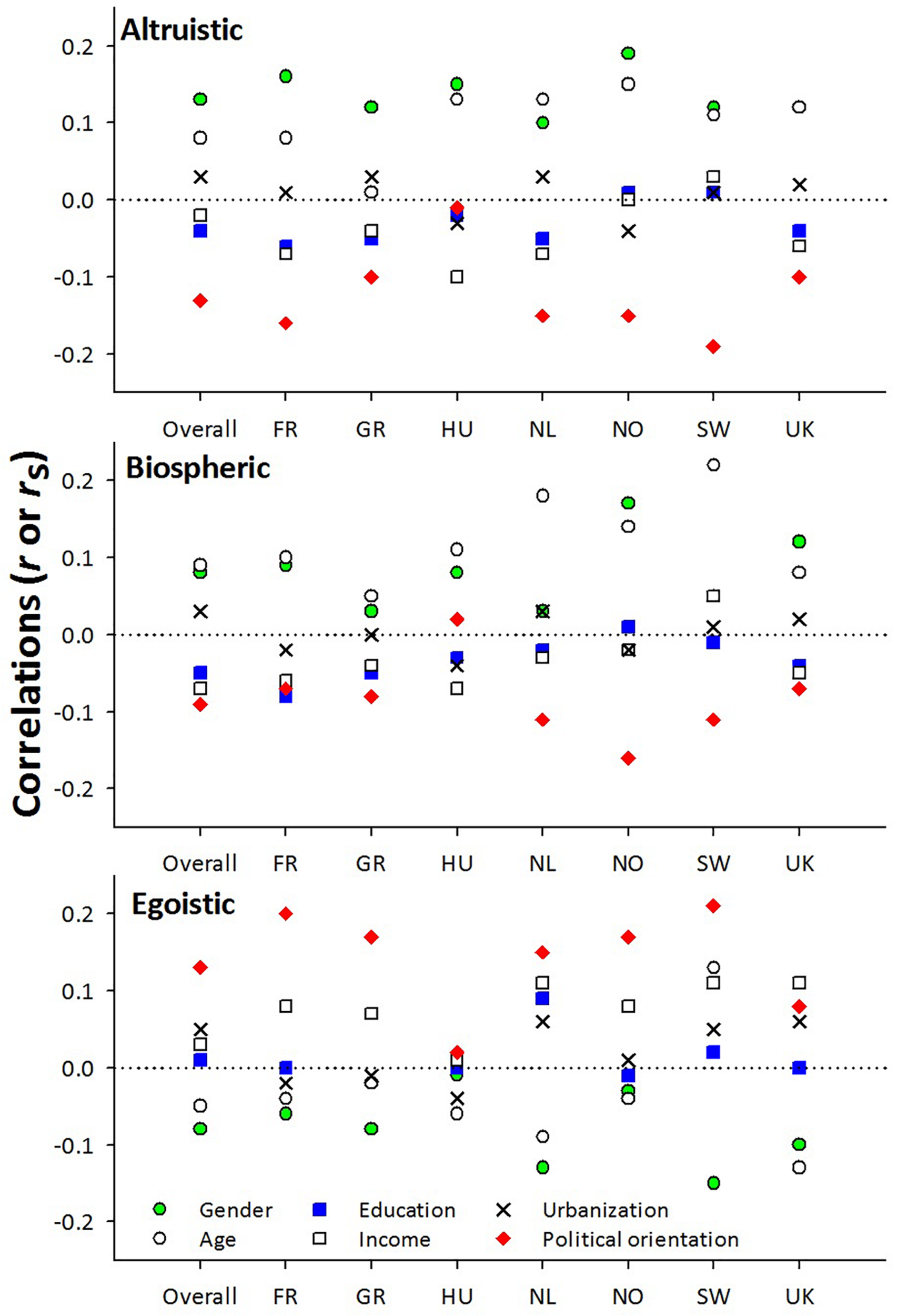 Figure 1 shows the correlations between the sociodemographic variables and altruistic, biospheric, and egoistic values for the overall sample and for the seven countries separately.