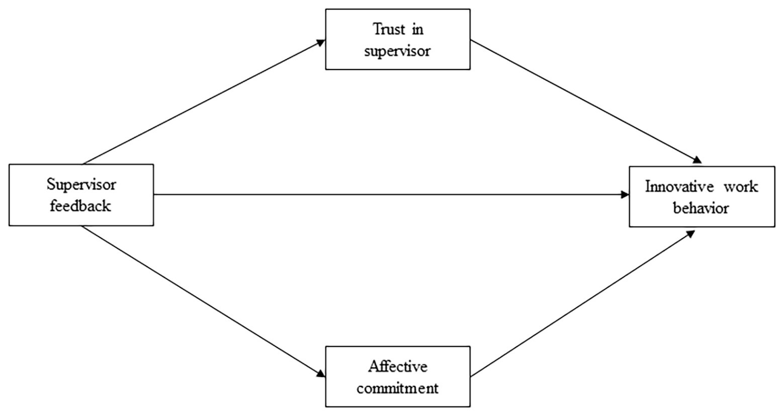 In keeping with the call for empirical testing of rarely explored mediators of the motivational job resources-IWB relationship (Li and Hsu, 2016), two key mediators, trust in supervisors and affective commitment, are included to help understand the underlying mechanisms through which supervisor feedback influences IWB in the workplace. Drawing from organizational support theory (OST) and social exchange theory, this study attempts to fill the research gap and develop the unique framework that examines the mediating roles of trust in supervisor and affective commitment in linking supervisor feedback and IWB in the public sector.
