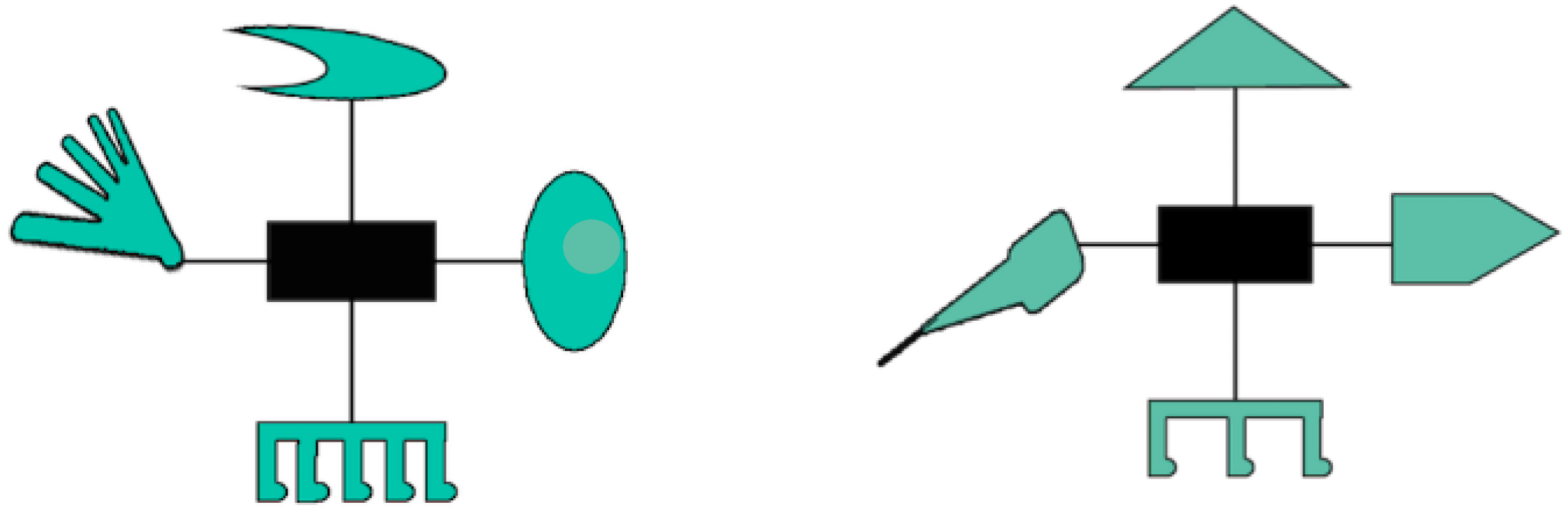 The task utilized Medin and Schaffer’s 5–4 category structure (see Table 1). Stimuli were borrowed from Rehder and Hoffman (2005b) and consisted of 16 creatures, each featuring a head, wings, feet, and tail surrounding a central rectangular body (see Figure 1). Each feature appeared in one of two forms, with each variation assigned a code of 0 or 1. For example, the head was either pointed or oval, and the feet had either three or five toes. Each creature was a combination of the four features in one of their two variations, coded as a set of 0s and 1s (e.g., 1-1-0-0). Each feature was approximately 4° in width and height, and the entire creature was 12° of visual angle in width and height. Similarly to Rehder and Hoffman (2005b), the wings and the feet were the highly diagnostic features (associated with a category in 0.77 of training trials), the head was the moderately diagnostic feature (associated with a category in 0.66 of training trials), and the tail was the minimally diagnostic feature (associated with a category in 0.55 of training trials). The eye was removed from the head feature in the current experiment.