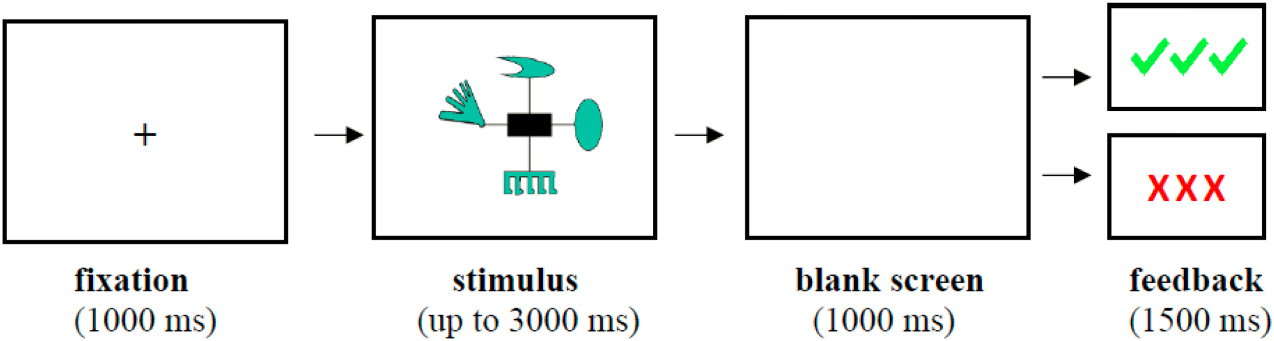 Each trial started with a fixation point in the center of the screen for 1,000 ms, followed by the stimulus, which appeared for up to 3,000 ms or until the participant responded with a button press to indicate group membership (A or B). Each response was followed by a blank screen for 1,000 ms and with a visual performance feedback for 1,500 ms (see illustration of a trial sequence in Figure 2). If a response was not made within the allotted 3,000 ms, participants were presented with a visual message prompting them to respond faster on the next trials.