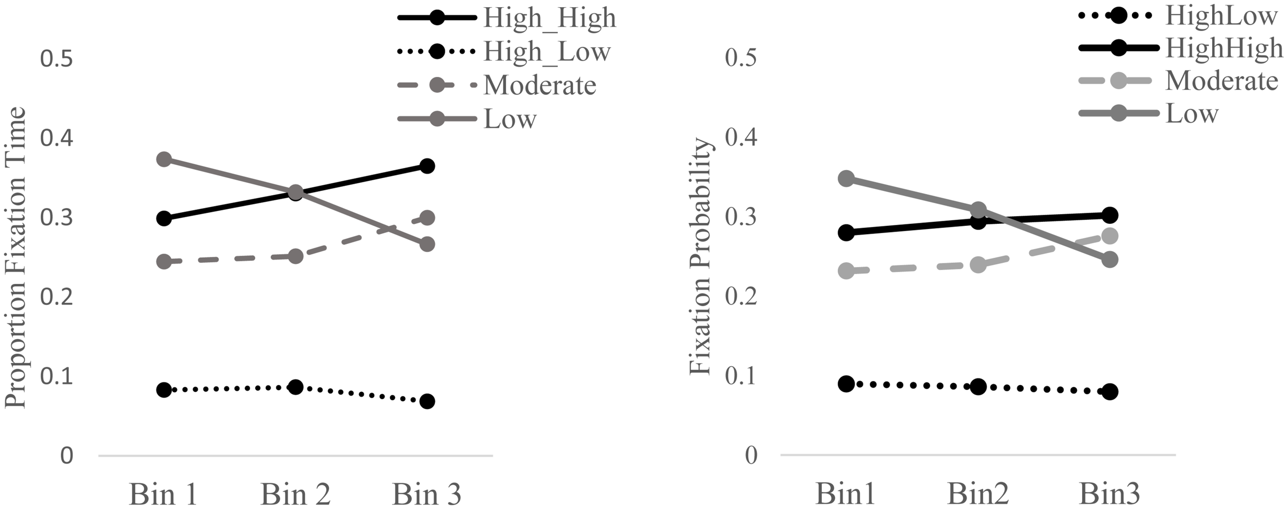 Proportion fixation time (left) and fixation probability (right) for each of the four features (High_High, High_Low, Moderate, Low) across time (i.e., in each of the three Bins).