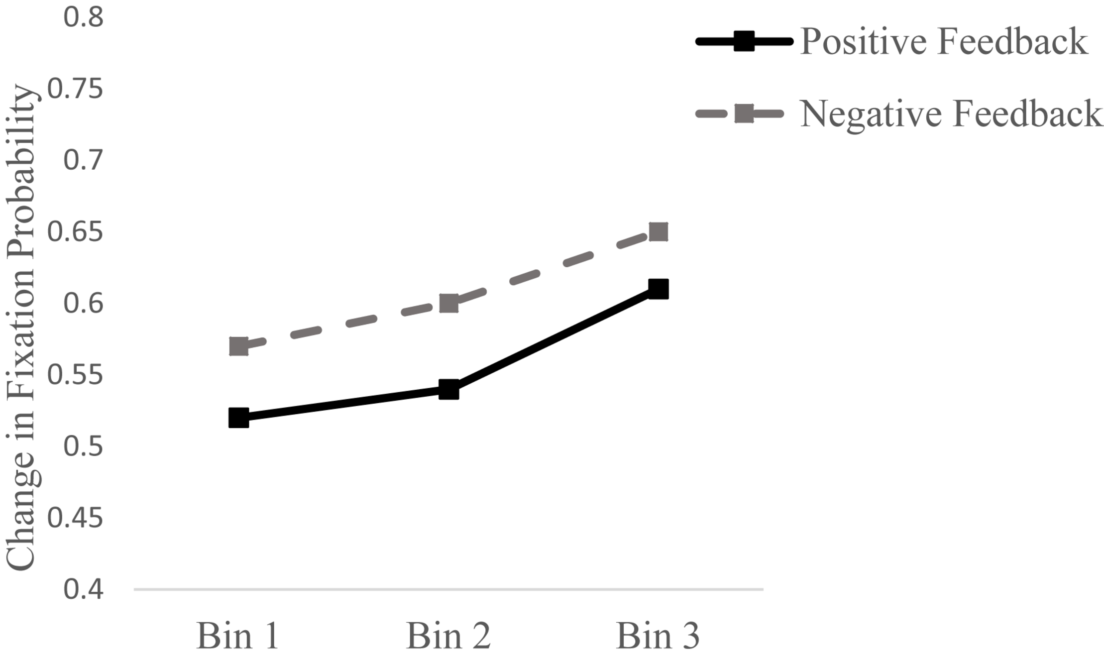 A repeated measures ANOVA of change in fixation probability as a function of Valence and Bin resulted in no effect of Bin, F(2, 16) = 1.75, p = 0.19, η2p = 0.09, but revealed a main effect of Valence, F(1, 17) = 6.53, p = 0.02, η2p = 0.27, indicating that change in fixation probability was greater after negative feedback (see Figure 4). No interaction between Bin and Valance was found, F(2, 16) = 0.03, p = 0.96, η2p = 0.002. These results indicate that change in fixation probability (i.e., change in whether a feature was fixated on) was greater after negative feedback throughout the learning process.
