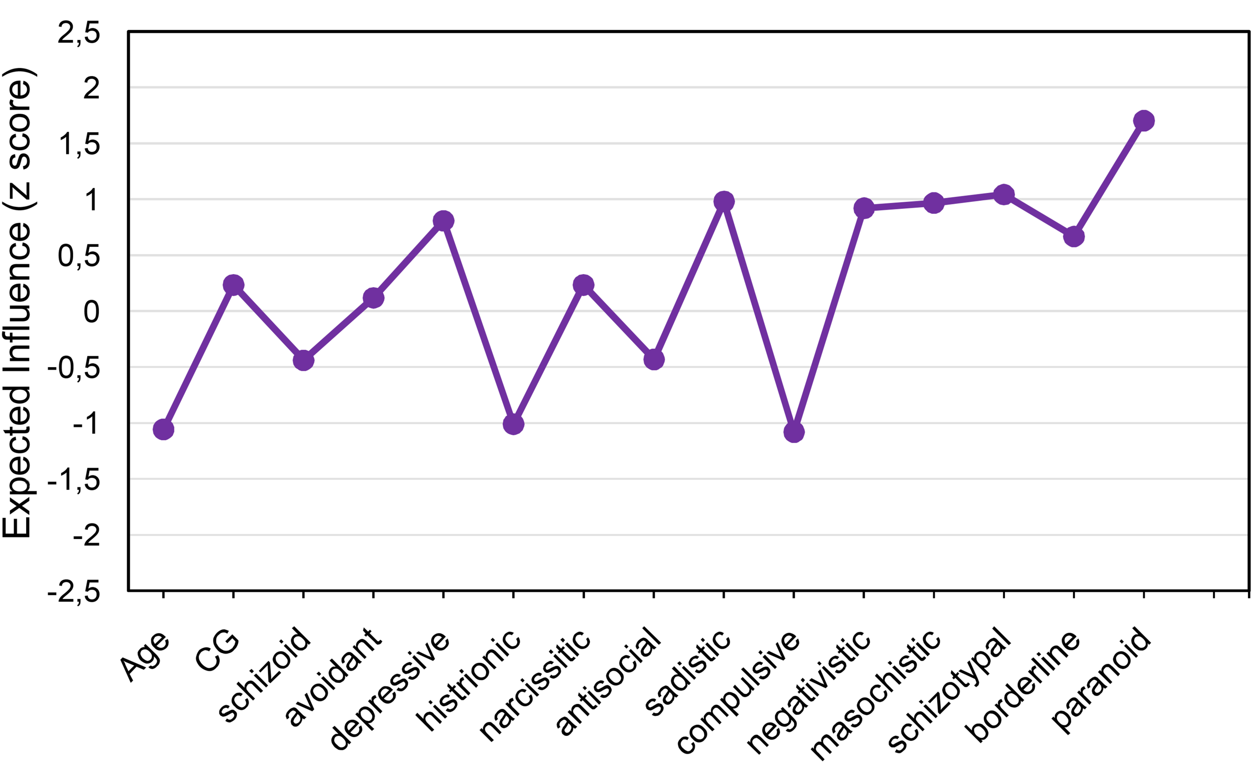 Network Centrality. Because negative edges were present in our LASSO networks, we relied on EI as our measure of centrality (Robinaugh et al., 2016). Complicated grief is the second least central construct and reveals low EI (0.24) (Figure 2), suggesting that it contributes little to the network. Interestingly, the pattern of avoidant personality disorder also showed the lowest degree of EI (0.12), suggesting that it exerts less influence on the overall network of personality disorder symptoms. The pattern of personality disorder nodes with the strongest influence on the network was paranoid (EI = 1.71).