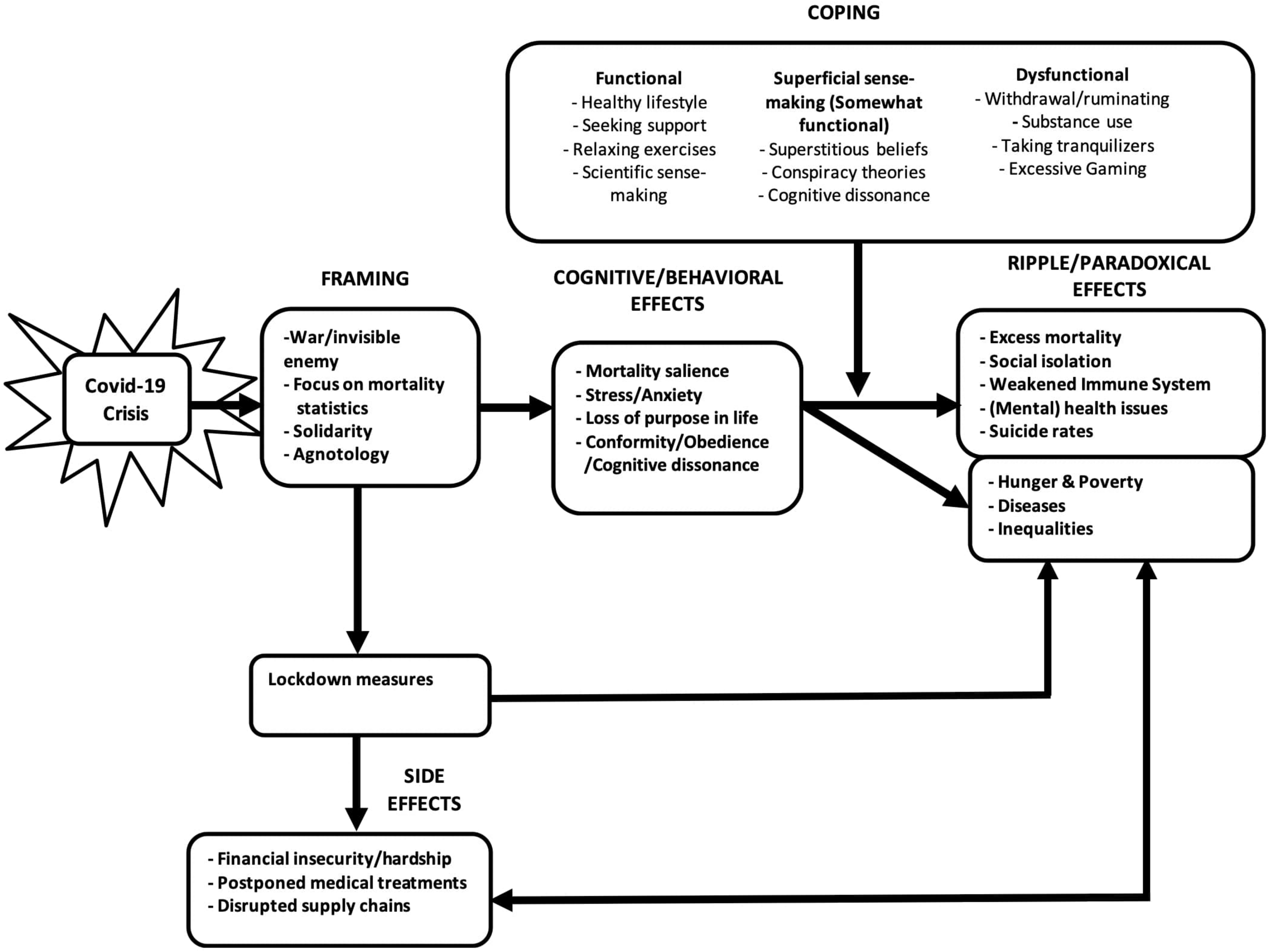 In the current review, I aim to elucidate mechanisms that explain the attitudes and behaviors of people in general as well as behavioral mechanisms in the current situation (See Figure 1). I will describe the processes through which the decisions for the lockdowns in many countries are internalized and upheld through a process of framing, social influence and superstition. I will focus on the effects that the lockdowns have on the general population, rather than on the effects on individual patients and caregivers, which I deem to be a special group but that has been given attention elsewhere (Lin et al., 2007; Lee et al., 2018; Kim et al., 2019). I will describe how the framing of the situation by political leaders and in the popular press influences mortality salience, and stress and anxiety, and in turn drives cognition and behavior (i.e., cognitive dissonance, conformity and obedience). Many of the lockdown measures however are paradoxically related to a weakened immune system, stemming from a loss of purpose in life, social isolation and related mental health issues, leading to outcomes such as excess mortality, increased suicide rates, and an increase in non-Covid related diseases (cf. Torales et al., 2020; Zhou et al., 2020). Since these effects are stronger for vulnerable groups, this will widen the existing inequalities (Holmes et al., 2020). I will give attention to this paradox that, as a society, we seem to be compromising the immune system and economic security of the majority of people in the lockdown situation. The effects will in part be moderated by the effectiveness of the coping styles used by individuals (See Figure 1). Due to space constraints, I will give a brief summary of each topic, and also briefly describe how they are related and influence each other. In this review, I do by no means try to be exhaustive, but will limit myself to the main drivers of human behaviors, and the expected consequences. The model may act as recommendation for future research, as the model, although based on prior research, has not been tested yet. Since other researchers already suggested policy considerations in order to help decision-makers prevent the most horrifying scenario such as a scenario of excess mortality from extreme hunger and famine (e.g., Hevia and Pablo Andrés, 2020; Schippers and Martins Van Jaarsveld, 2020; Zetzsche, 2020), I will not repeat that here. Below. I start with the explaining that the way the situations is framed result I adherence to lockdown measures. Following I explain the right side of the model, the results and negative side effects, before discussing the remainder of the model (See Figure 1 and Table 1, supplementary material). I will end with recommendations for interventions that may be used to mitigate the negative effects of the lockdown on the general population.