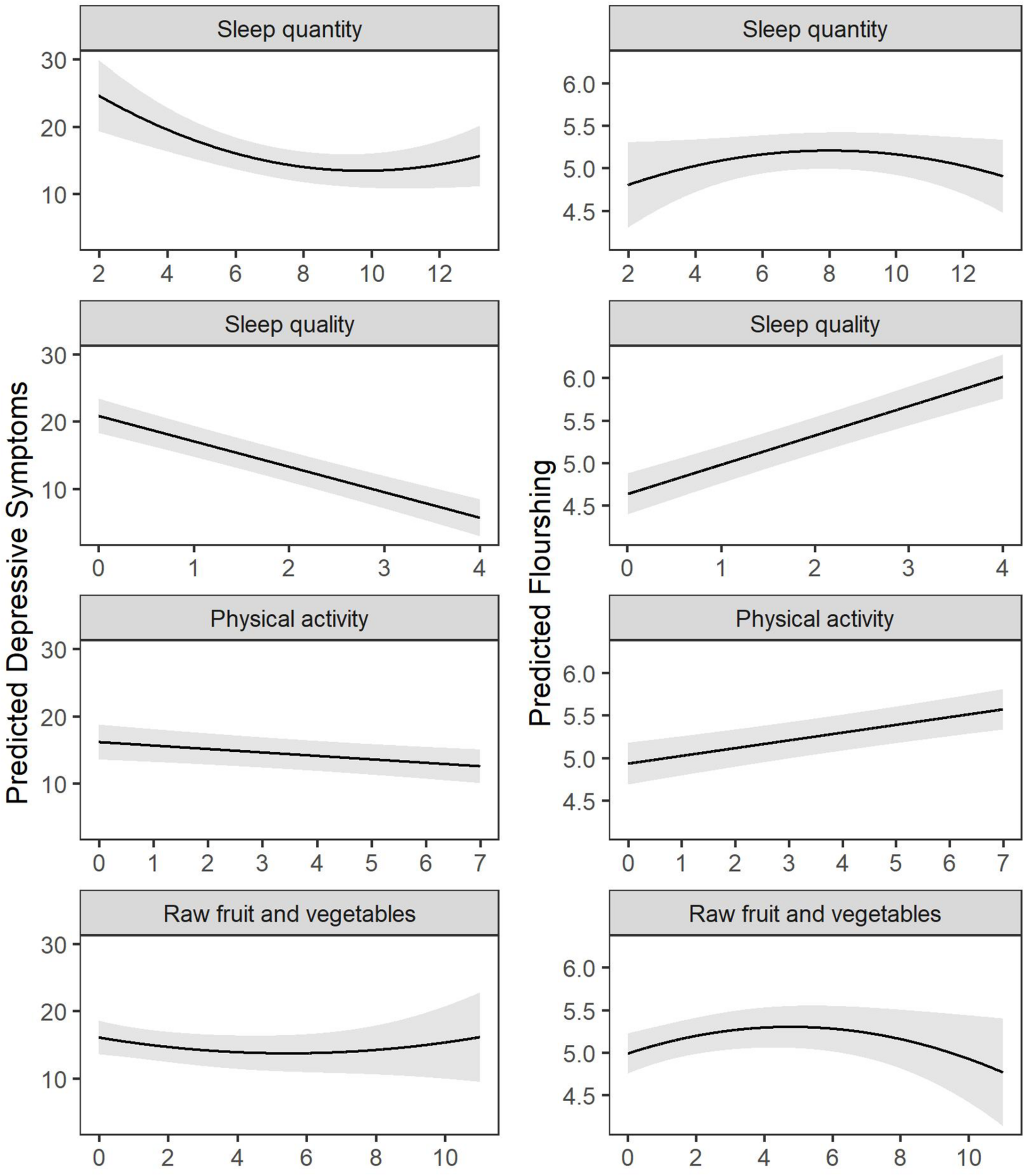Consumption of raw FV but not processed FV significantly predicted flourishing. Flourishing was highest for young adults who ate 4.8 servings of raw FV per day, and, similar to sleep quantity, too little raw FV (< two servings) or too high raw FV (> eight servings) were associated with lower flourishing. This result replicates previous research showing that raw rather than cooked or processed FV may be more beneficial to well-being and that excessive intake may be problematic (Brookie et al., 2018). However, contradictory to previous research, raw FV did not predict lower depressive symptoms in our controlled models, which may be due to the shared variance with physical activity which outperformed raw FV in predicting depressive symptoms. Similarly, unhealthy food consumption did not significantly predict mental health or well-being in our controlled models. This may be due to the relatively low consumption of unhealthy foods in the present sample, our narrow measurement of unhealthy foods, or possible covariation with other factors that played a stronger role.