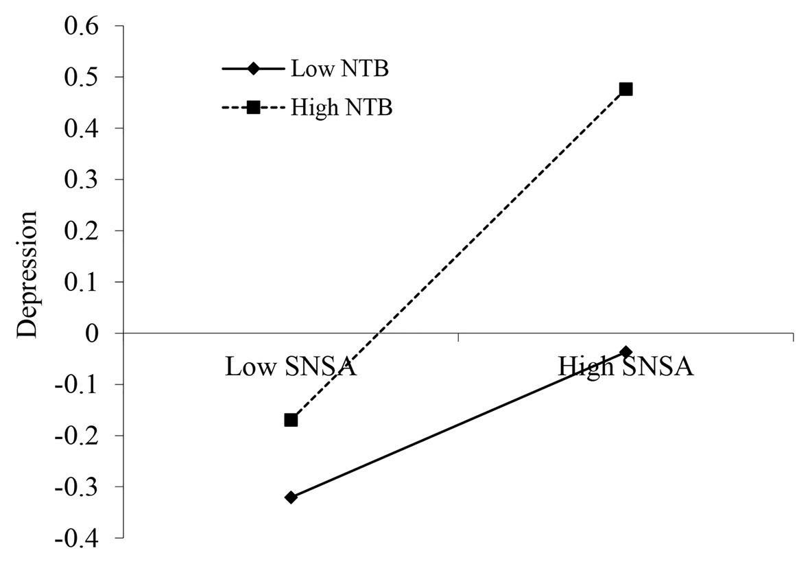 As Table 3 shows, there was a significant main effect of SNS addiction on adolescents’ materialism (β = 0.25, p < 0.001), and this effect was moderated by NTB (β = 0.07, p < 0.05). For clarity, we plotted the regression of adolescents’ materialism on SNS addiction at high and low levels of NTB (1 SD below the mean and 1 SD above the mean, respectively; Figure 2). The simple slope tests showed that, for adolescents high in NTB, high level of SNS addiction was related to high level of materialism (βsimple = 0.32, p < 0.001). For adolescents low in NTB, the link between SNS addiction and adolescents’ materialism was much weaker (βsimple = 0.18, p < 0.001). Model 1 of Table 3 showed that there was a significant effect of SNS addiction on depression (β = 0.23, p < 0.001), and this effect was moderated by NTB (β = 0.09, p < 0.01). For clarity, the regression of adolescent depression on SNS addiction at high and low levels of NTB (1 SD below the mean and 1 SD above the mean, respectively) was plotted (Figure 3). Simple slope tests showed that for adolescents high in NTB, high level of SNS addiction was associated with high level depression (βsimple = 0.32, p < 0.001). For adolescents low in NTB, the link between SNS addiction and adolescent depression was much weaker (βsimple = 0.14, p < 0.01). At last, Model 2 of Table 3 indicated that the main effect of depression on materialism was significant (β = 0.10, p < 0.01), and it was not moderated by NTB (β = −0.03, p > 0.05).