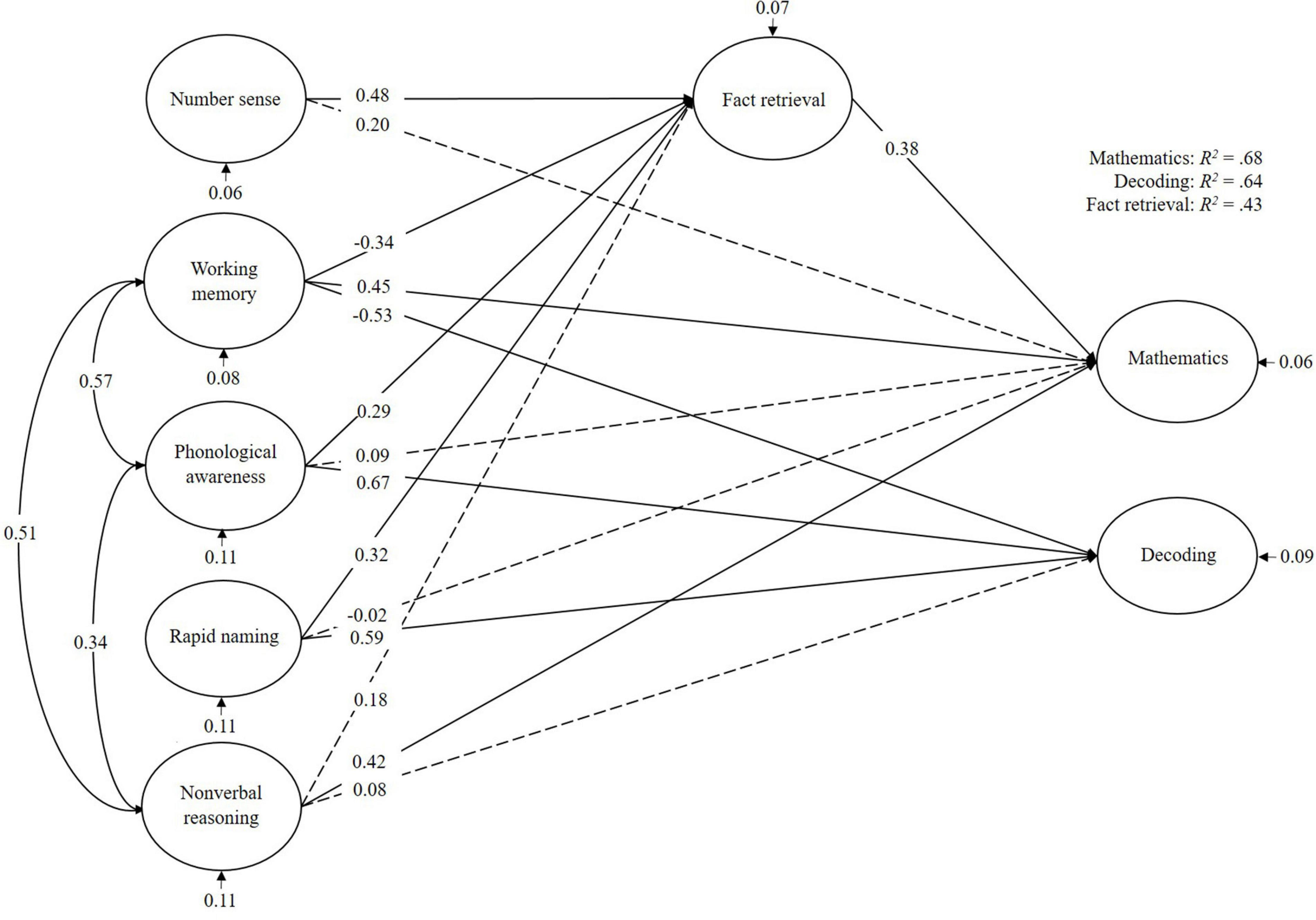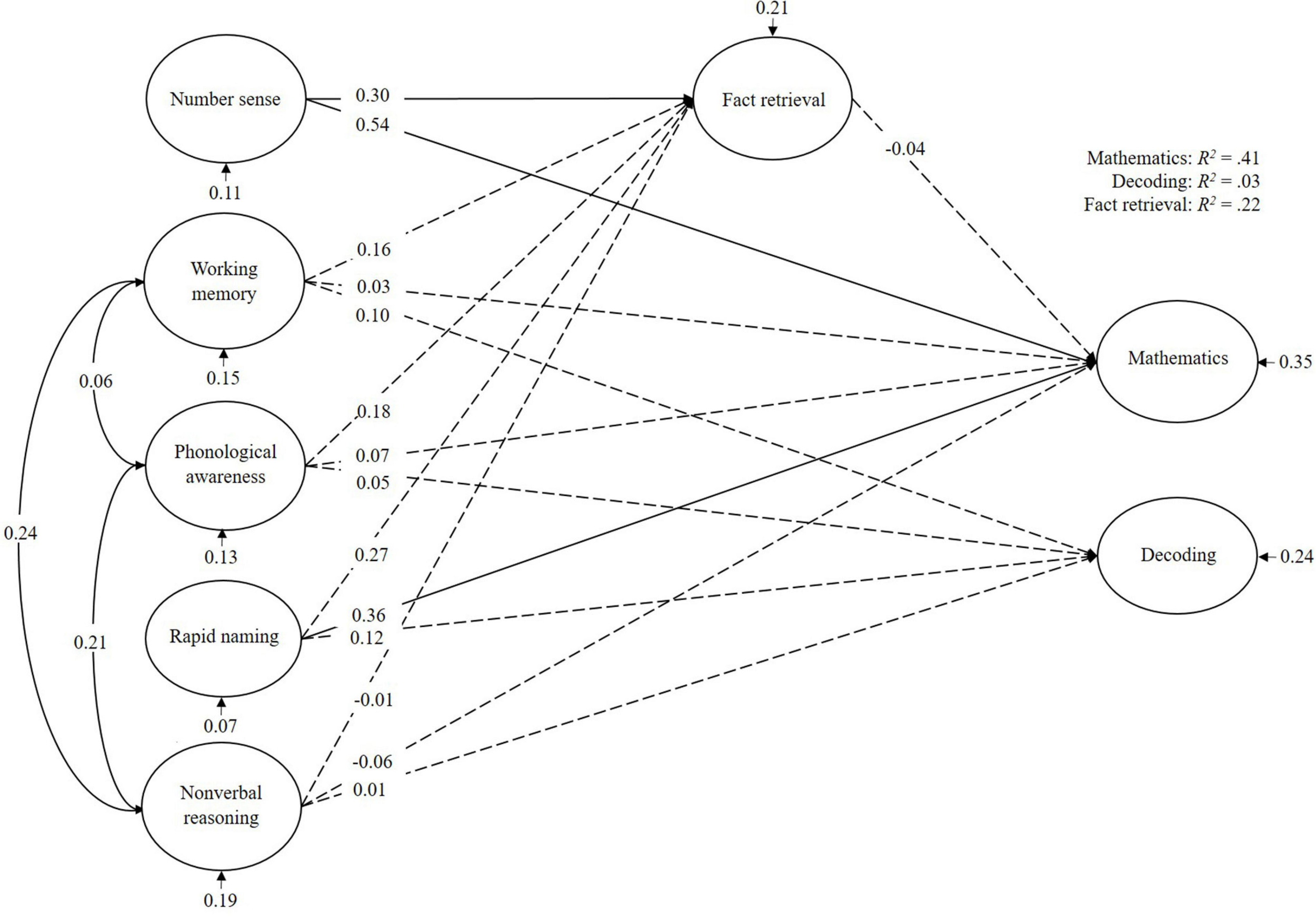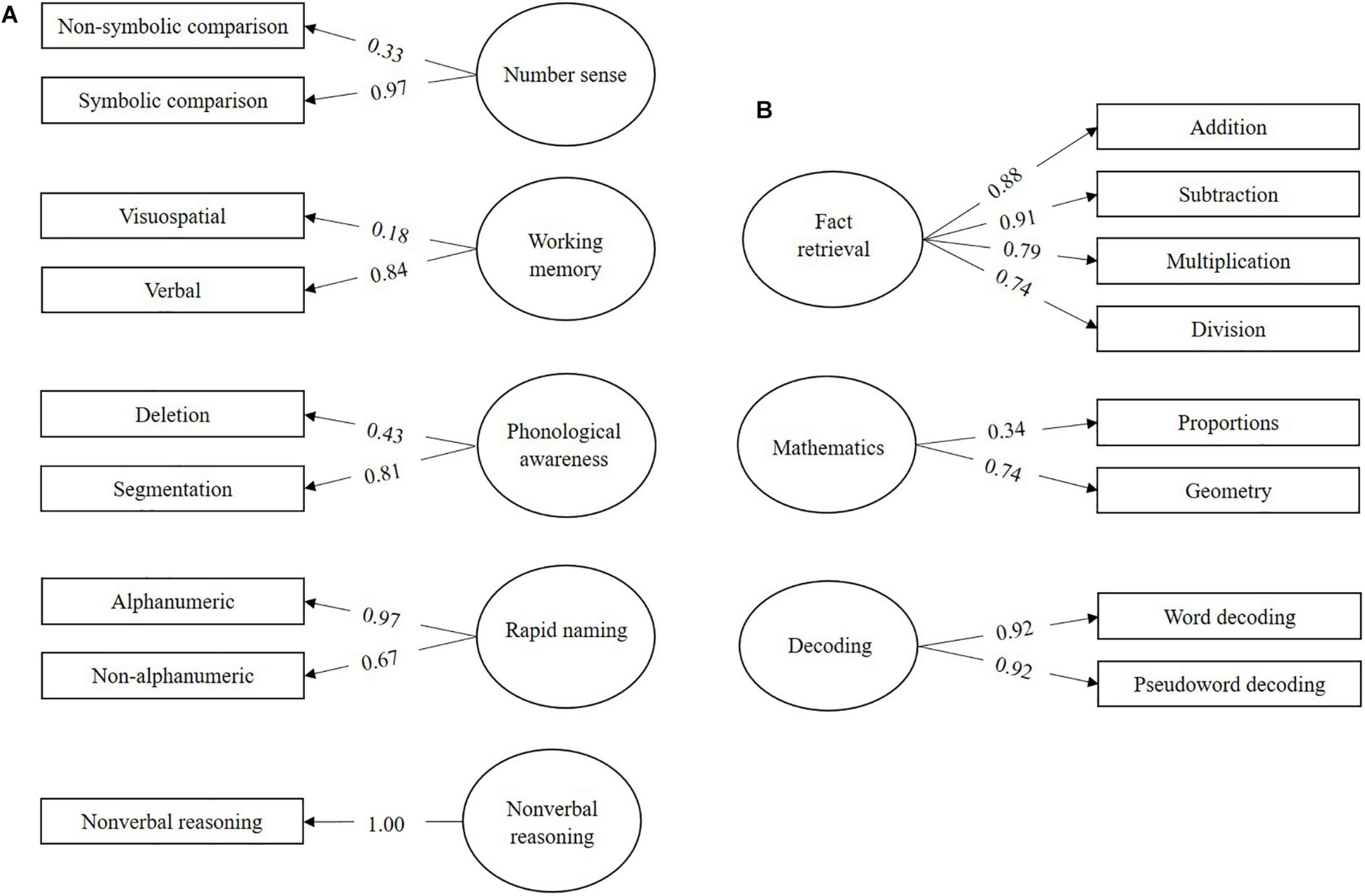 All variables were approximately normally distributed (standardized | skewness| and | kurtosis| < 3.0). This was computed by dividing the skewness and kurtosis statistics (obtained in SPSS, version 25) by their standard errors. Outliers that diverged more than three standard deviations from the mean (>| 3.29|) were winsorized. Subvariables of all cognitive constructs were correlated in the total sample (BFs > 16.07; strong support; Jeffreys, 1961). This was the case for number sense (r = 0.34 for non-symbolic and symbolic comparison), working memory (r = 0.16 for verbal and visuospatial working memory), phonological awareness (r = 0.35 for deletion and spoonerism), and rapid naming (r = 0.64 for alphanumeric and non-alphanumeric rapid naming). It should be noted, however, that the correlation between both working memory constructs was relatively weak, but both observed variables were still combined into one latent variable in further analyses in line with previous research (LeFevre et al., 2013; Giofrè et al., 2014; Gray et al., 2017). There was strong support (BFs > 7313174) for correlations between working memory, phonological awareness, and non-verbal reasoning, see Table 2. The other cognitive skills were not related to each other, thus covariances for those associations were set to zero in further analyses.