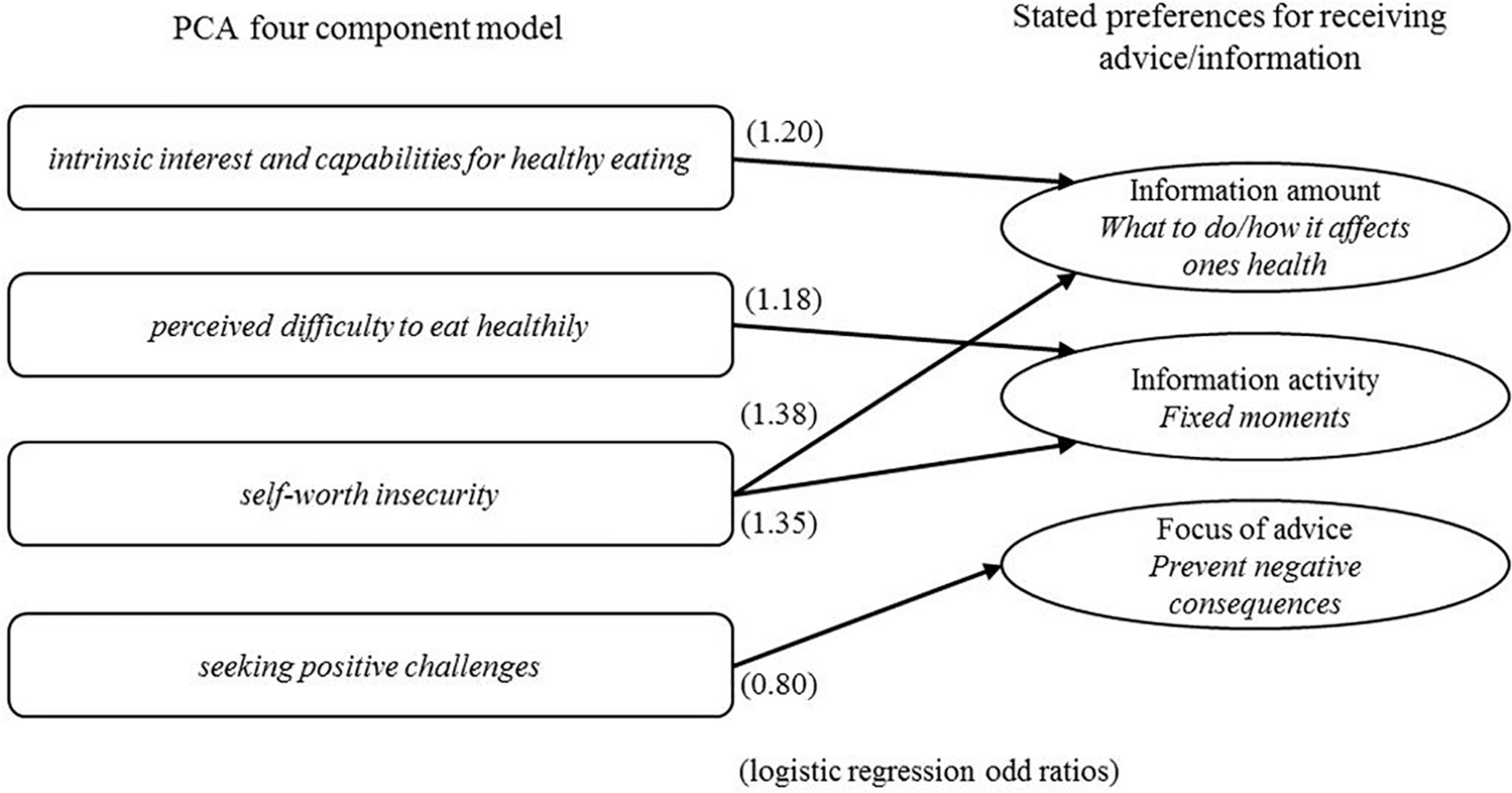 A Principal Component Analysis (PCA) was conducted on the 68 items in the survey (using SPSS v.23), which resulted in a four dimensional solution on which a Varimax rotation was performed. The scores for this four dimensional model are used to predict reported preferences for three different forms in which dietary health information can be provided to people. These predictions have been carried out separately by means of three logistic regression analyses (using SPSS v.23). The reason to carry out three separate logistic regressions, rather than combining these into one model in order to include interactions between dependent variables is rather practical. One of the aims of this study was to explore the possibility to use the psychological profiles obtained to provide tailored dietary advice in a specialized computer program (ultimately in a smartphone-app). The three dependent variables are linked to matters that could be separately implemented in such an app. Furthermore, in hindsight, the correlations between the three variables turned out to be very low (Supplementary Material).