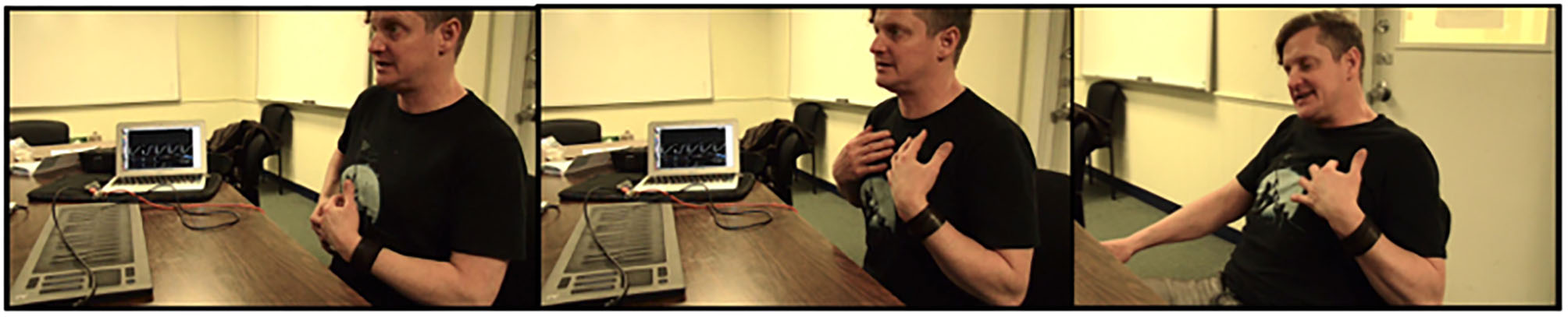 We organized a test session at the Immersive Presence Lab at CIRMMT with Black on June 27, 2016. Black was touring with his band Endangered Blood. They had a concert in Ottawa the night before and a another one in Montreal that night. Consequently, we had the opportunity to book him for a whole afternoon to test the vest. A few days before the test, Grupp sent him a MaxMSP patch to ensure that the first TIZI prototype could interface with his Reaktor patches and sound libraries. The technical setup for the test included a drum kit9, two speakers to play back the electronics, lighting, a couple of cameras, and audio recording equipment to document the performances (see Supplementary Material). We invited Del Tredici to improvise with Black during the test, which resulted in a 12-min duo performance using TIZI, followed by a solo experimentation of the sensors.