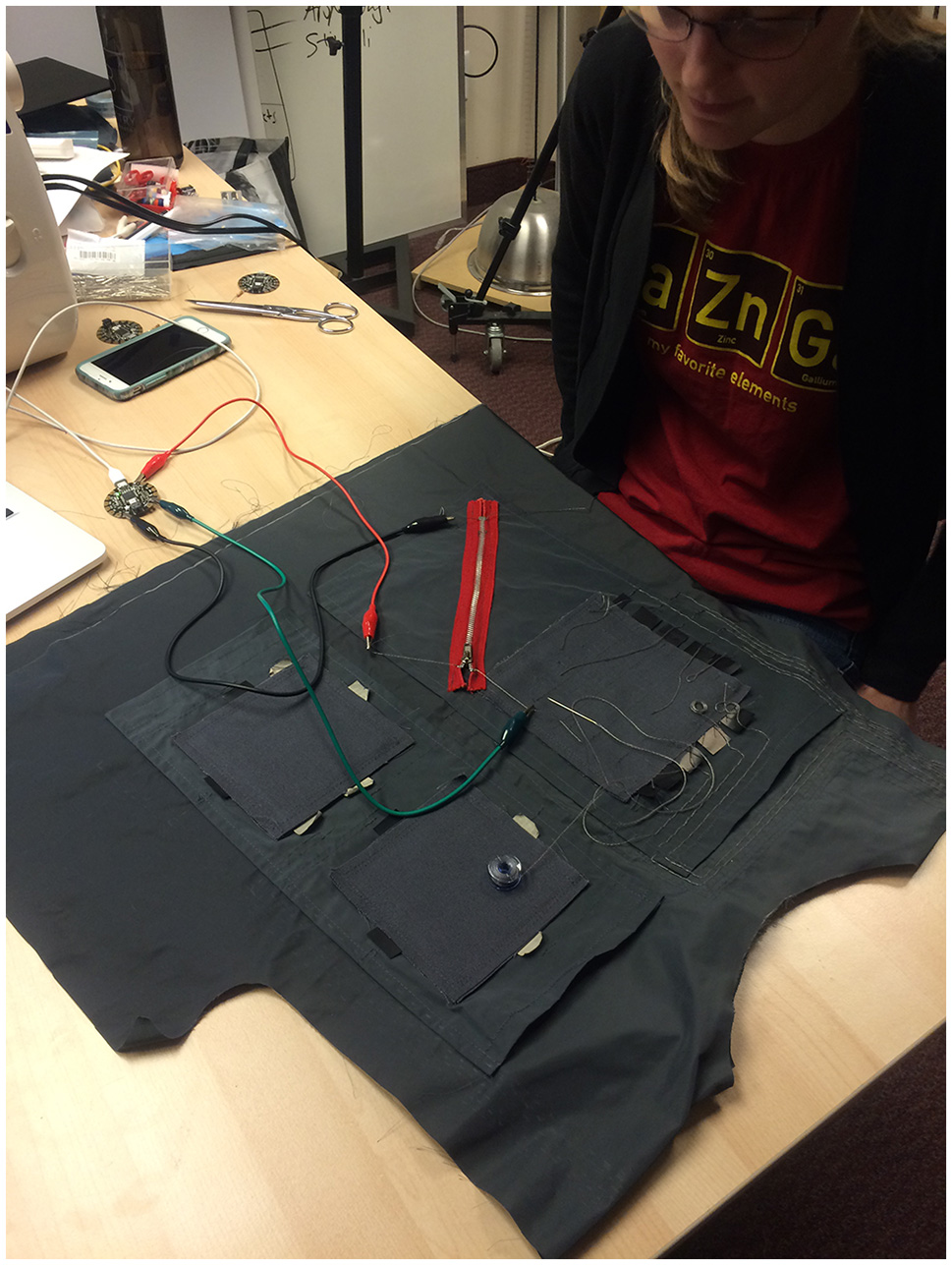 The development of the first TIZI prototype was divided into three rounds: (1) the concept and test of four individual fabric sensors: XY pad, XYZ pad, a linear potentiometer (using a zipper with metal teeth), and a 5 × 5 matrix; (2) the design of the vest; and (3) the assembly of the sensors on the vest. This process allowed flexibility in the final placement of these modular sensors on the garment.