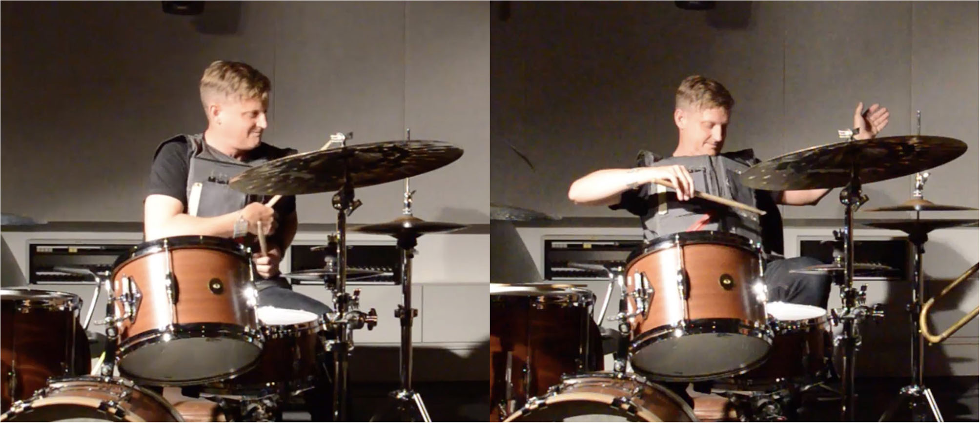 Considering our final research question (RQ3), the Grupp's selection as semi-finalist in the Guthman Competition enabled the team to assess the potential of transferring our custom-made wearable to another male performer. Music student Rook, who had never simultaneously performed on acoustic drums and electronics before enjoyed his experience rehearsing and performing on stage with the novel interface. This event confirms that TIZI, initially designed to meet Black's criteria, could effectively be adopted by a less-accomplished male improviser. While Black aimed to incorporate the wearable into his already-defined concept of acoustic drums with electronics performance, Rook composed the competition demonstration with the goal of highlighting the functionalities of the device. This situation led Rook to map his gestures with sound effects completely differently than Black used during the CIRMMT performance test with the initial prototype. According to Grupp, the unlimited personalisation and creative options that TIZI offers, i.e., leaving the mapping to the discretion of its user, was key to Rook's pleasure when experimenting with the interface.