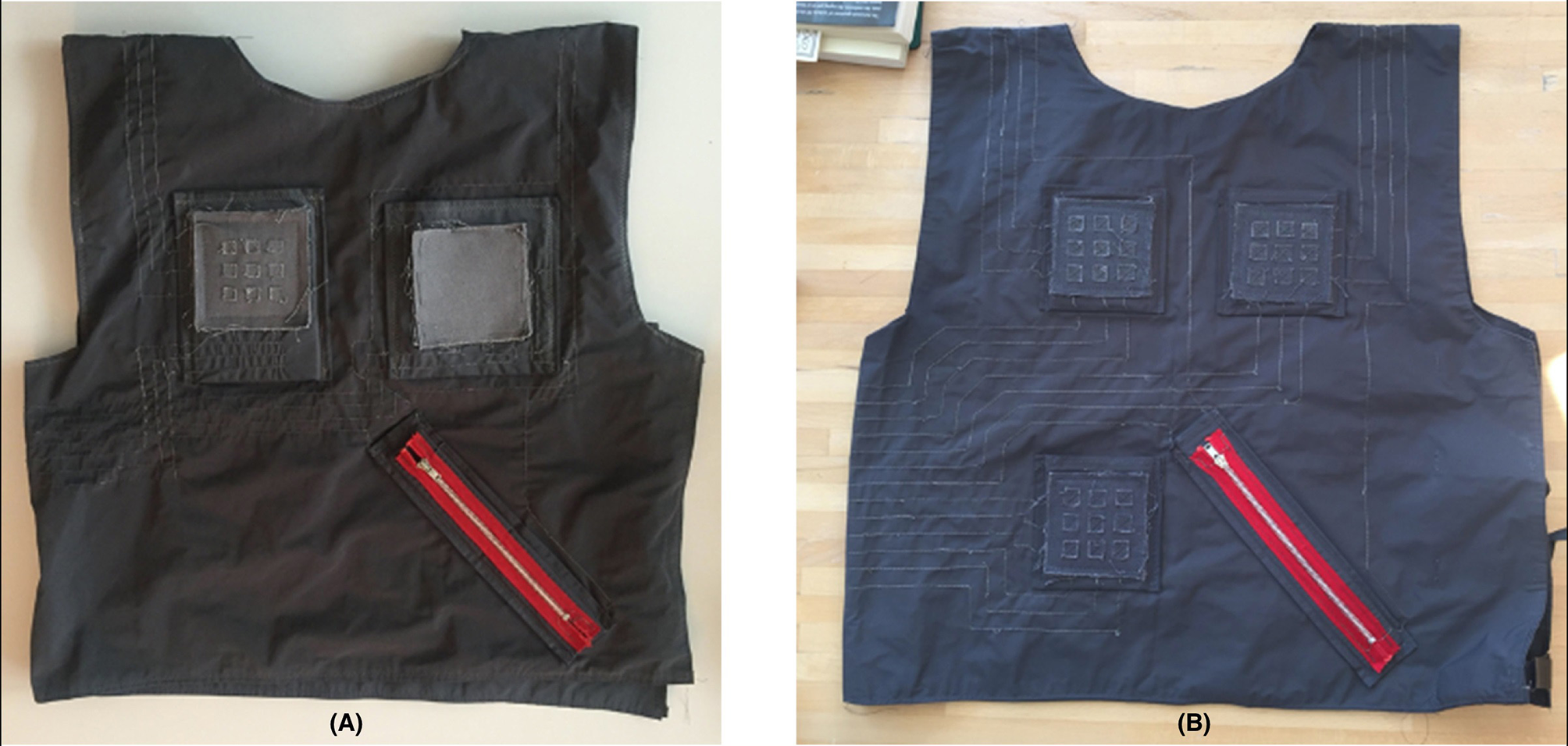 The second version of TIZI addressed some of the technical issues observed during the test session at CIRMMT (Figure 7A). For instance, the second prototype did not include the XY pad that had not been convincing during the test but kept the XYZ pad because the Z (pressure) presented good potential. We reduced the original 5 × 5 matrix to a 3 × 3 matrix to reduce the number of digital outputs in the microcontroller. The stitches were completely isolated using nail polish to reduce the electric coupling. Furthermore, to avoid short-circuiting, the majority of stitches were passed under the armpits, leaving Voltage on one shoulder and Ground on the other shoulder. Hence, even if the fabric slid together in the shoulders due to upper-body movements, Voltage and Ground would not touch. The zipper remained the same, because it performed quite well during the entire test session.