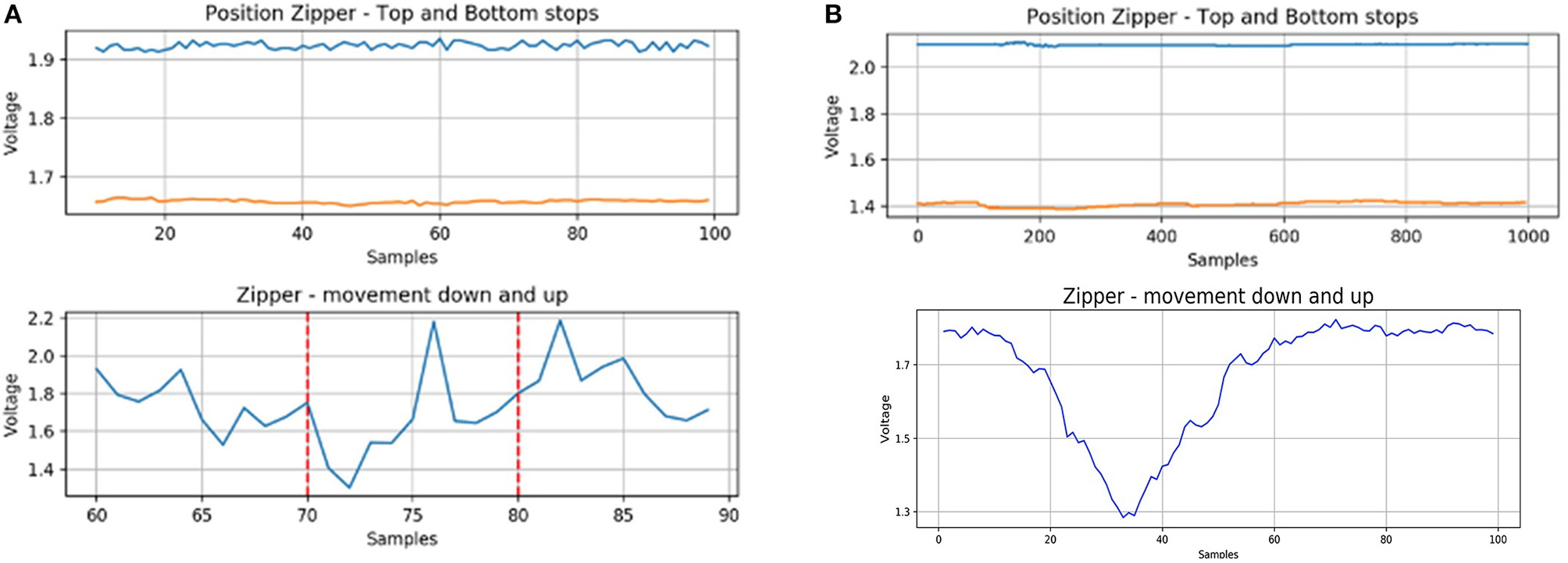 Figure 8. (A) Zipper second version; (B) Zipper third version. The top graphs show the reference signal from when the metal slider of the zipper is at the top (blue) and bottom (orange) stops. The bottom graphs show the zipper being moved down and up again.
