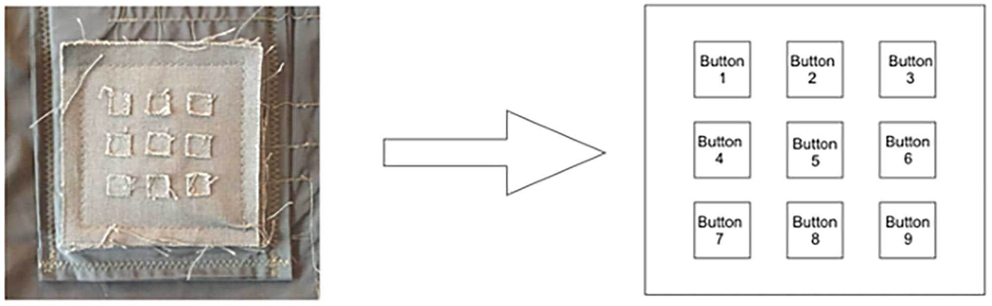 Figure 9. Schematic of the matrix with the mapping of the buttons; left: picture of the matrix sewn into the second version of the vest; right: the distribution of buttons in the matrix.