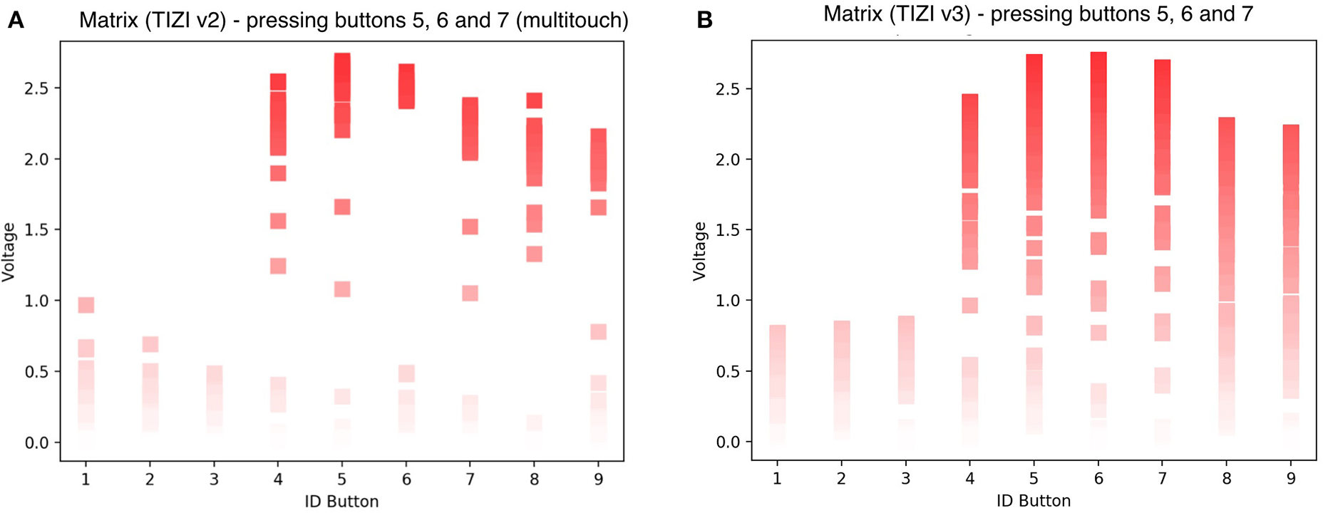 Figure 11 displays the response of the 3 × 3 matrix when touching two or more buttons simultaneously. The left graph (A) shows three buttons pressed at the same time (buttons 5, 6, and 7)—we can isolate two of these buttons, but button 4 has higher amplitude than button 7, resulting in a false positive. The proximity of the buttons creates coupling between neighbors. The third version improves this (B), isolating buttons 5, 6 and 7. While we can identify which buttons are touched, other buttons detect a lot of signal that would likely result in false positives for buttons that are not touched (A). This might result from the small size of the squares (0.25 cm2 on the second version) and the finger therefore touching other buttons. In the third version of the vest, an increased button size (1 cm2) shows an improvement (B).
