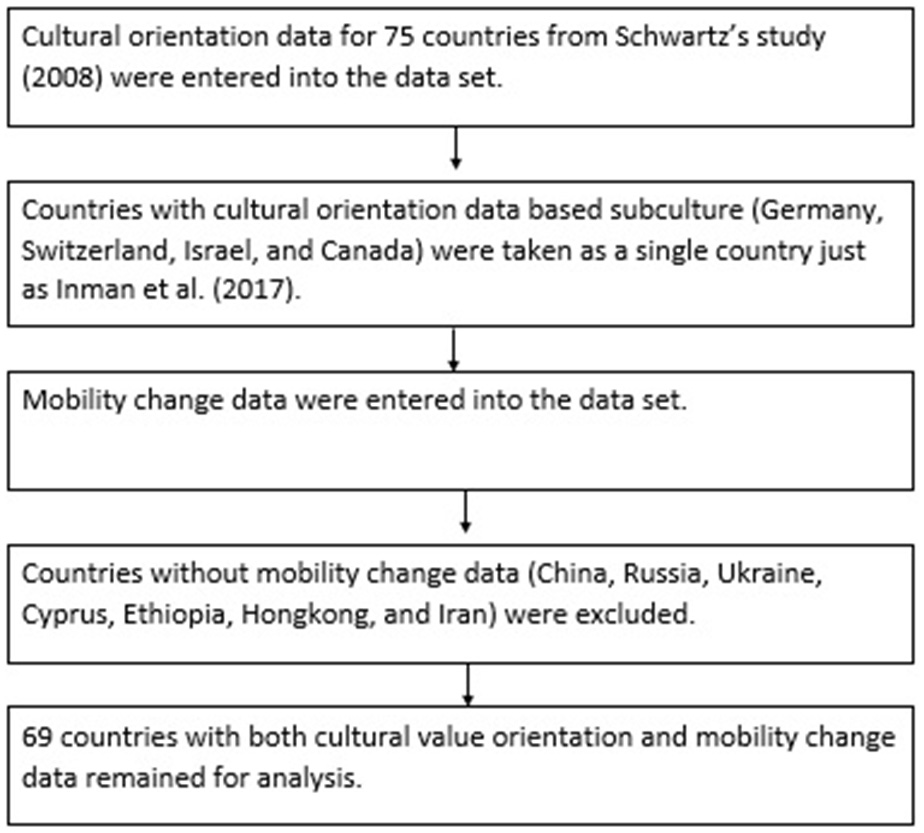 Figure 1 depicts the data integration process after which 69 countries2 were available for analysis. Workplace, transit station, and retail, recreation, and residential area mobility changes were assessed in relation to cultural value orientations. All countries experienced a decrease in mobility except in Taiwan, where mean workplace mobility slightly increased. Thus, Taiwan was excluded from only the analyses pertaining to workplace mobility. All mobility change data (mean value of respective data for April 26 and May 6, 2020) were then re-formulated as percentage decrease or increase compared to the baseline measure. Only workplace, transit station, and retail and recreation mobility were examined as there was an overall decrease in mobility compared to the baseline. Residential area mobility was examined as a percentage increase in staying at home compared with the baseline measure.