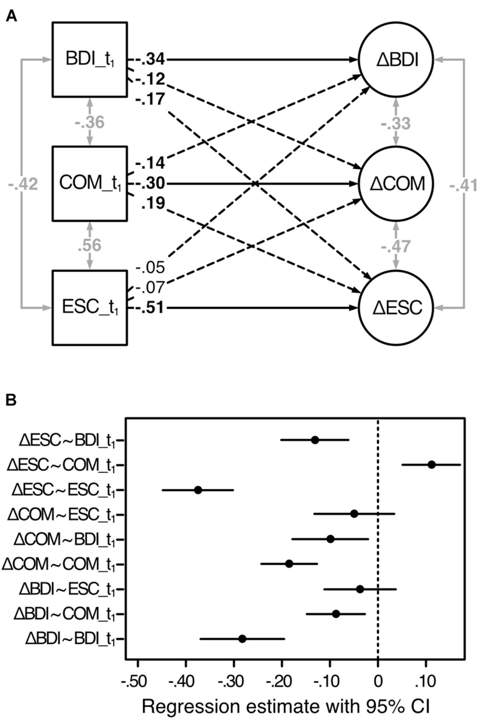 Estimated latent change score model of the change scores predicted by the baseline scores. Analysis based on the first sample (n1 = 459). BDI, depressive symptoms; COM, cognitive motivation; ESC, effortful self-control; t1, before treatment; Δ, latent change score (i.e., the change from t1 to t2). (A) Standardized regression coefficients are displayed. One-sided solid and dashed arrows refer to the model in Figure 1 and indicate directed effects (regression coefficients), two-sided gray arrows indicate undirected relationships (correlations). Coefficients in bold are significant for p < 0.05. (B) 95% confidence intervals of the unstandardized regression estimates, based on 1,000 bootstrap samples.