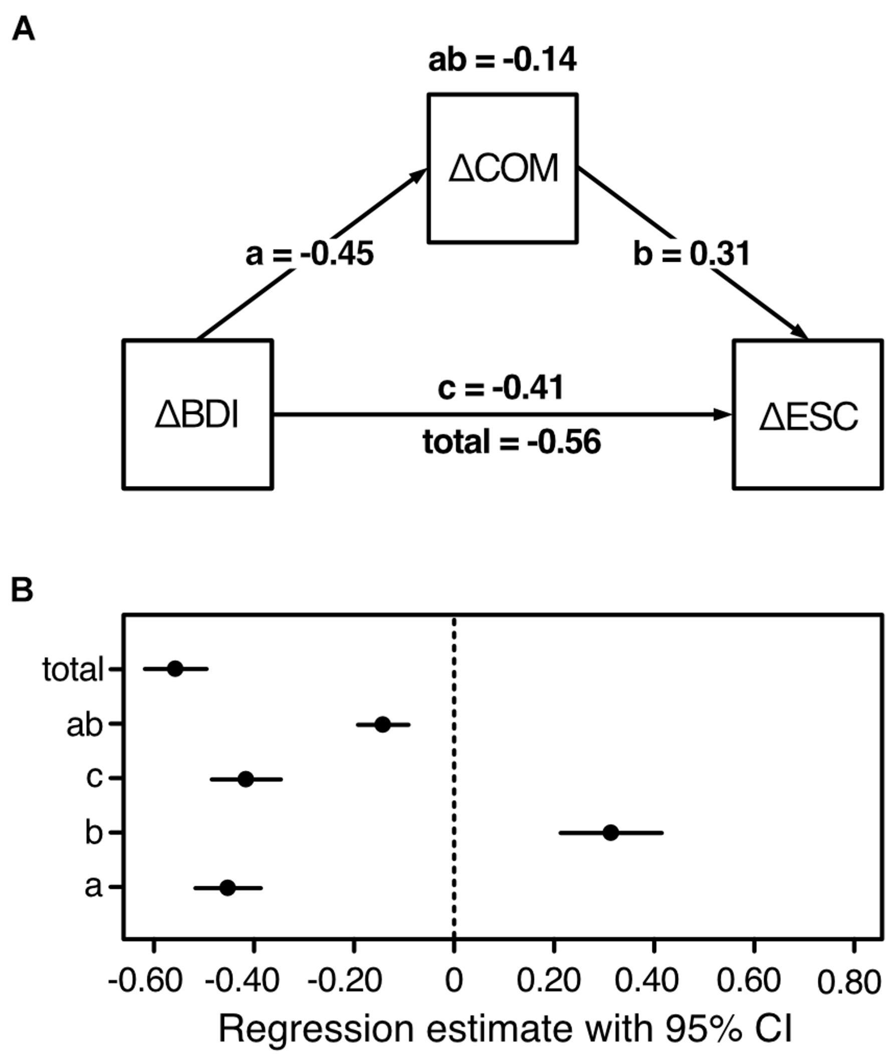 Model, unstandardized path coefficients, and CI of the unstandardized regression estimates are depicted in Figures 5A,B. The results confirmed our hypothesis. The total effect of ΔBDI on ΔESC [btotal = −0.56, 95% CI (−0.62; −0.49), βtotal = −0.11] was significantly, albeit not completely, reduced when ΔCOM was included as mediator [bc = −0.41, 95% CI (−0.48; −0.34), βc = −0.08]. This was reflected in the significant indirect effect [bab = −0.14, 95% CI (−0.19; −0.09), βab = −0.03]. The findings thus indicate that the change (i.e., increasing capacities) in COM, which was negatively associated with the change (i.e., release of capacities) in BDI [ba = −0.45, 95% CI (−0.52; −0.39), βa = −0.10] and positively with the change (i.e., availability of resources for) in ESC [bb = 0.31, 95% CI (0.21; 0.42), βb = 0.29], partially mediated the association between decreasing resources bound by depressive symptomatology and increasing resources available for self-regulation.