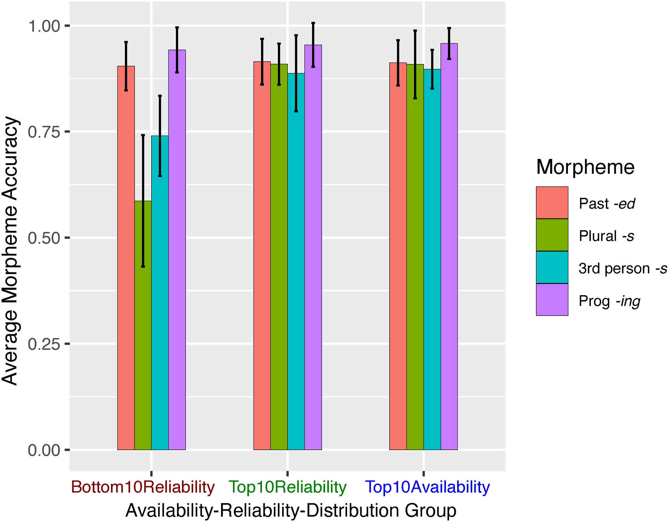 The accuracy scores of sentences for each morpheme in each ARD group are shown in Figure 2. To examine the effects of the two distributional factors, availability and reliability, on the production accuracy of the morphemes, we used generalized linear mixed-effect models using the “lme4” package (R package: lme4, RRID:SCR_015654, version 1.1-13, Bates et al., 2015) in R (version 3.3.3, R Core Team, 2017). The models were fit by maximum likelihood (Laplace Approximation), with random effects specified for subjects and items. Because the four target morphemes are inherently stratified in frequency in the corpus, e.g., past-tense -ed verbs are generally used more frequently than third-person -s verbs, the distributional factors are correlated with morpheme type. To reduce multicollinearity and to account for the between-morpheme differences, we first ran a mixed-effect model with morpheme type as the only fixed-effect predictor to serve as a baseline model which parses out the differences between the four morphemes. From there, we built up the model by incrementally specifying other predictors one at a time to identify the unique contributions of each. To determine which subject-level random effects to include, specifically whether or not to include the random slopes for subjects for each fixed-effect predictor, we ran two versions for each model, one with only random intercepts, and one further adding random slopes. We report the model with random intercepts for subjects unless adding random slopes significantly improves model fit, in which case we report the latter. The preliminary steps (testing morpheme type alone; morpheme type + morpheme reliability; and morpheme type + morpheme availability) are detailed in Supplementary Data Sheet 1, 1.2. We describe here the complete Model 1 involving all three fixed effects.