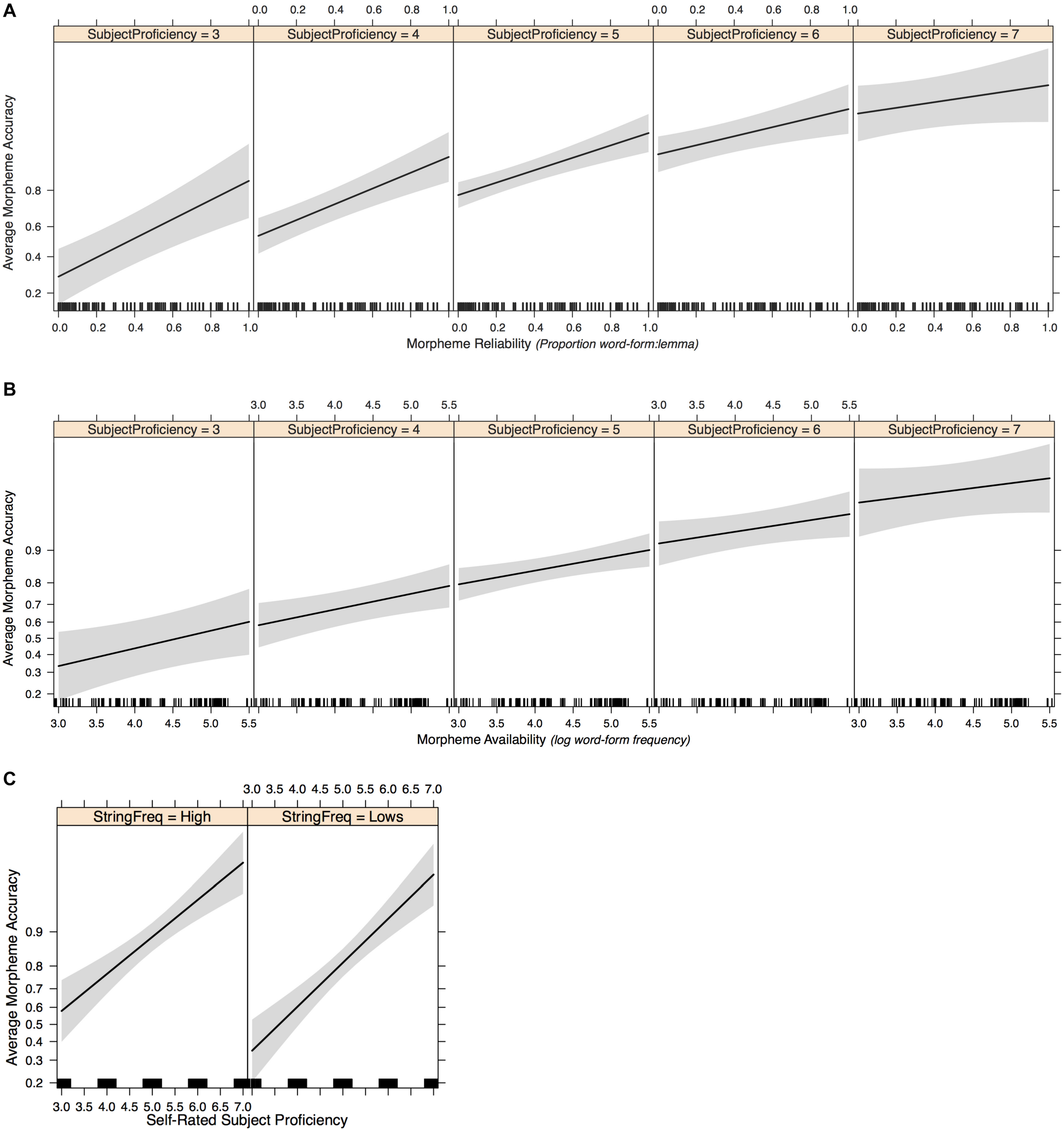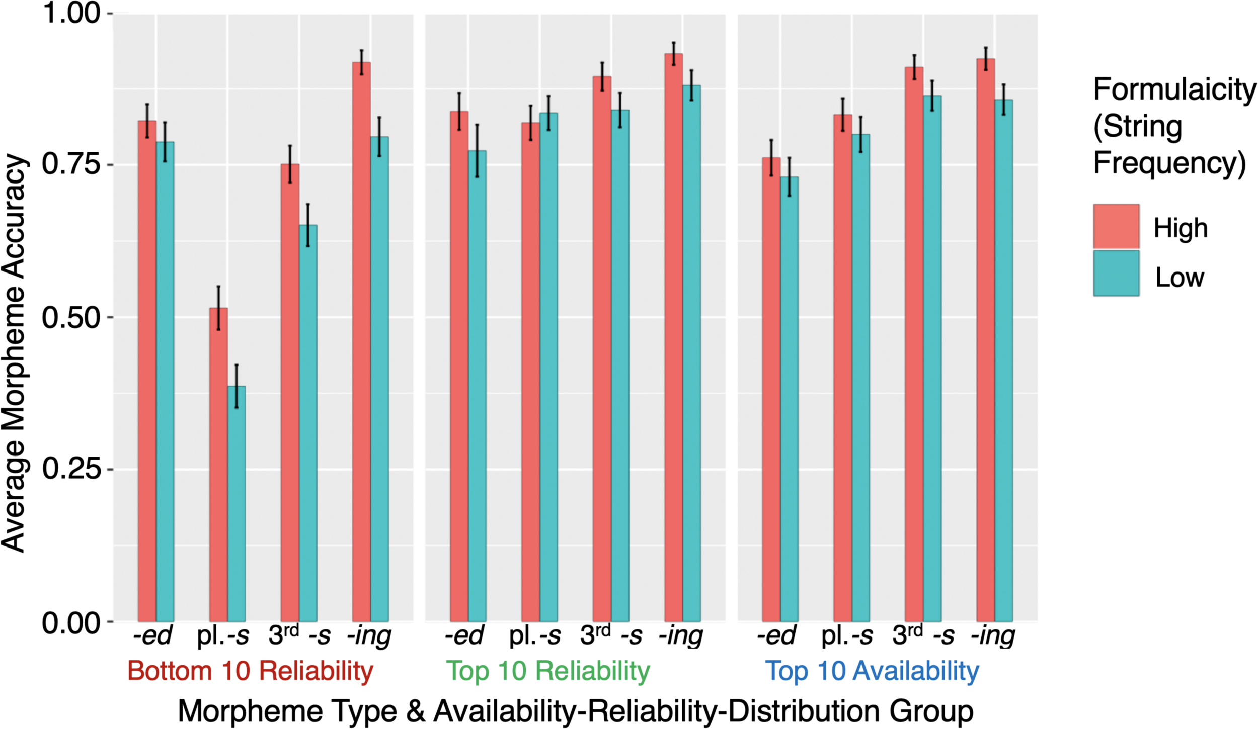 Together, these studies demonstrate that the three distributional factors of availability, reliability, and formulaicity pervasively affect language acquisition and processing. In the current study, we are concerned with their roles in L2 morphology, and whether particular exemplars are more easily recognized in the input and correctly produced because of their privileged distributions in the language.