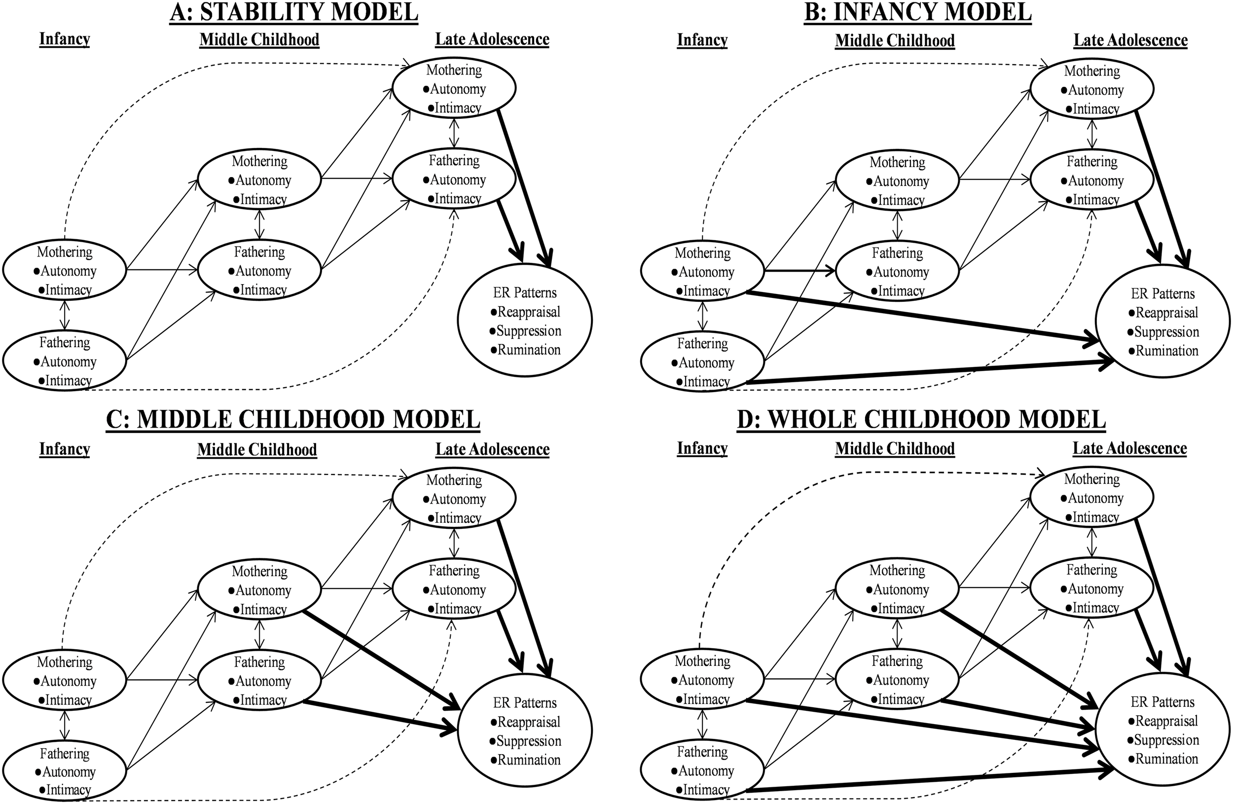 The Hypothetical Developmental Timing Models, including the Stability Model (A), Infancy Model (B), Middle Childhood Model (C), and Whole Childhood Model (D). The bolded paths represent the paths of our main interests. The non-bolded unbroken paths represent the first-order autoregressive and cross-lagged paths and concurrent correlations of mothering and fathering. The dotted paths represent the potential second-order temporal stability paths of the mothering and fathering. ER = emotion regulation.