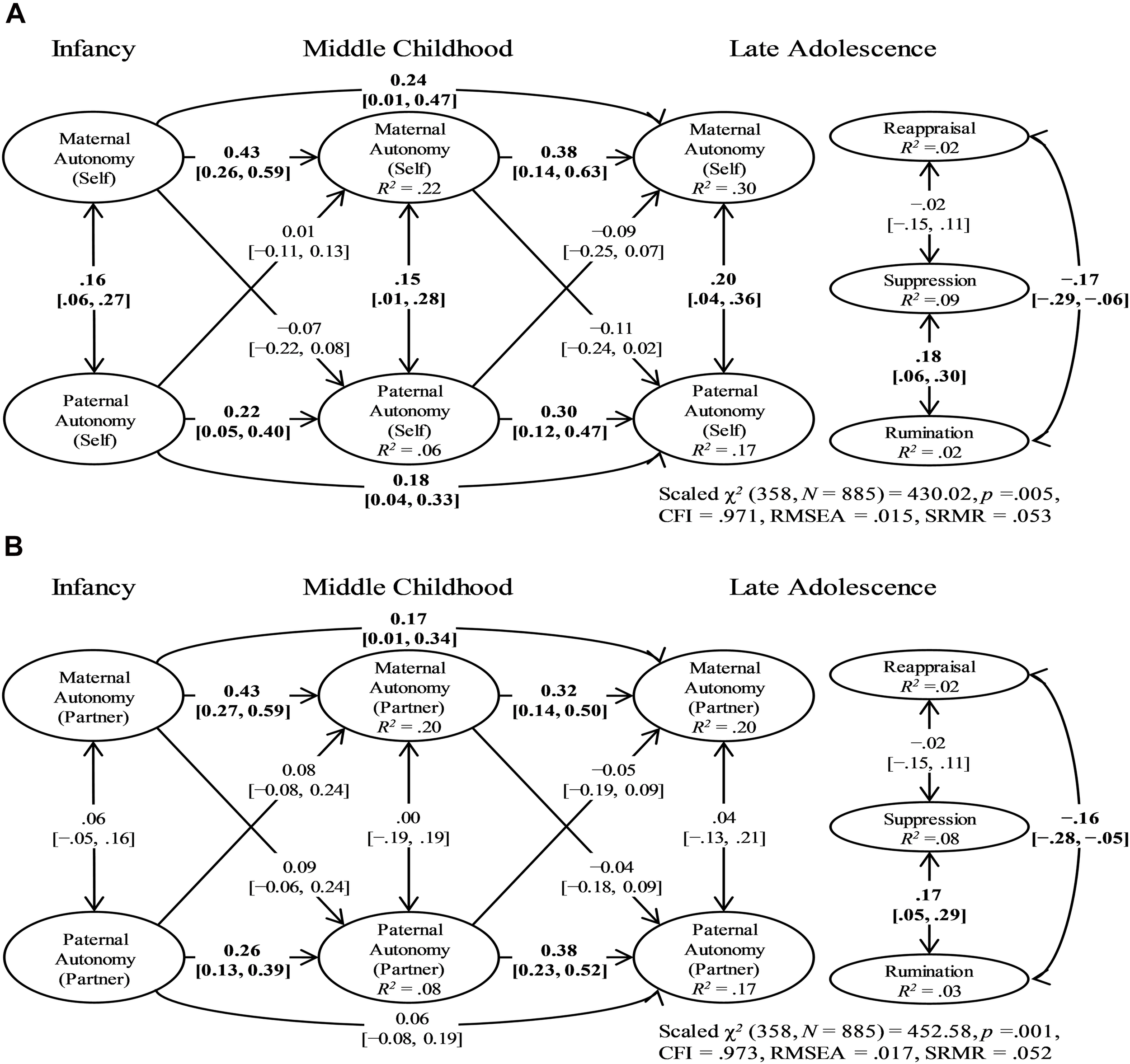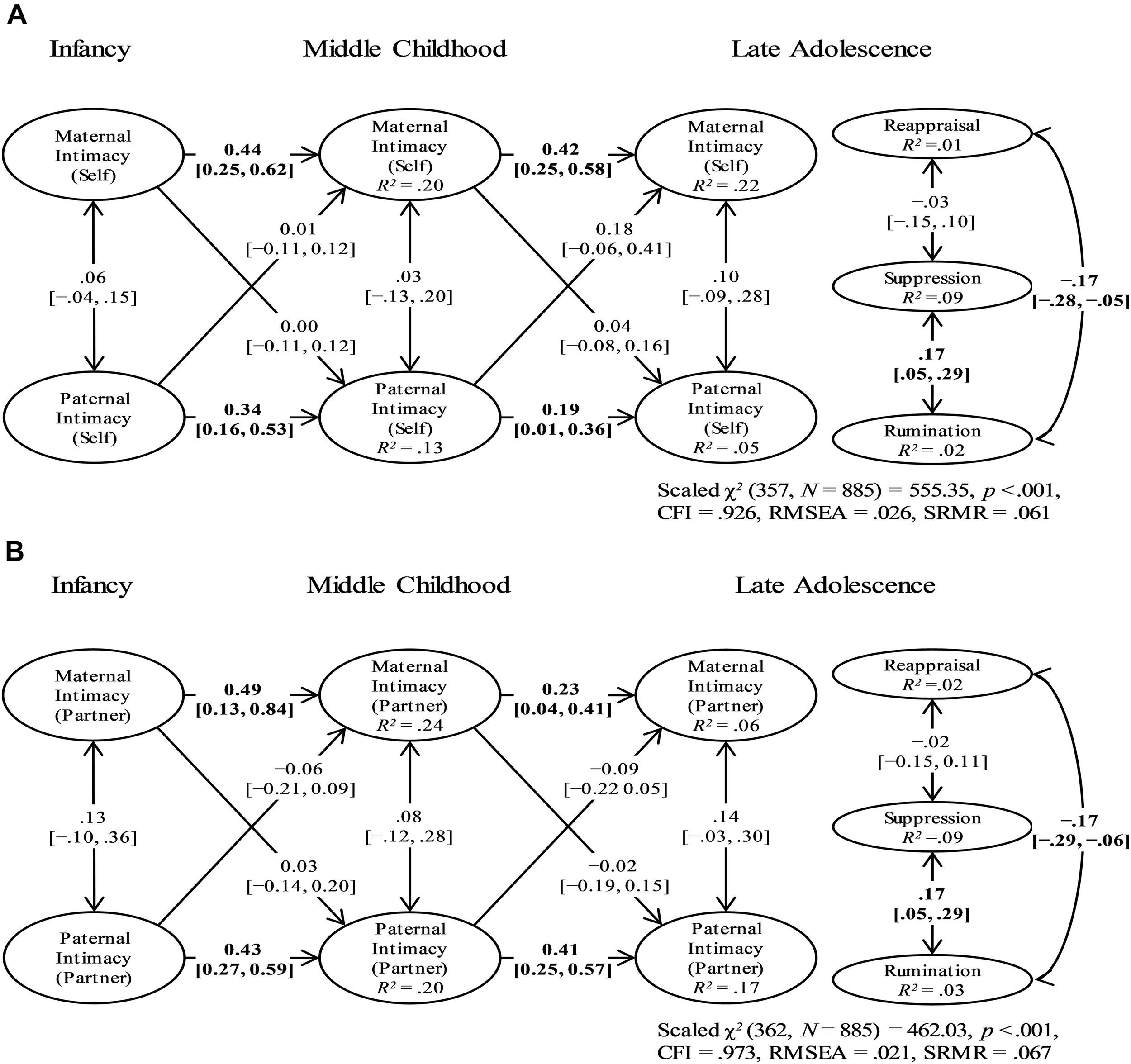 Regarding the measurement models of self- and partner-reported parental autonomy and intimacy (see Supplementary Material 3), all models showed adequate model fit when the configural time invariance structure was tested (self-reported parental autonomy: scaled χ2 (213, N = 885) = 256.48, p = 0.022, CFI = 0.982, RMSEA = 0.015, SRMR = 0.051; partner-reported parental autonomy: scaled χ2 (213, N = 885) = 278.45, p = 0.002, CFI = 0.981, RMSEA = 0.019, SRMR = 0.052; self-reported parental intimacy: scaled χ2 (213, N = 885) = 412.04, p < 0.001, CFI = 0.922, RMSEA = 0.033, SRMR = 0.066; and partner-reported parental intimacy: scaled χ2 (213, N = 885) = 345.97, p < 0.001, CFI = 0.967, RMSEA = 0.030, SRMR = 0.070). However, none of the models met any stricter assumptions of the time invariance (Supplementary Material 3), reflecting the descriptive discontinuity in the manifestation of parental autonomy and intimacy across development. Similarly, in all self- and partner-reported models, only the configural factorial invariance between the mothering and fathering held (Supplementary Material 3), suggesting that the maternal autonomy and intimacy differed from the paternal autonomy and intimacy.