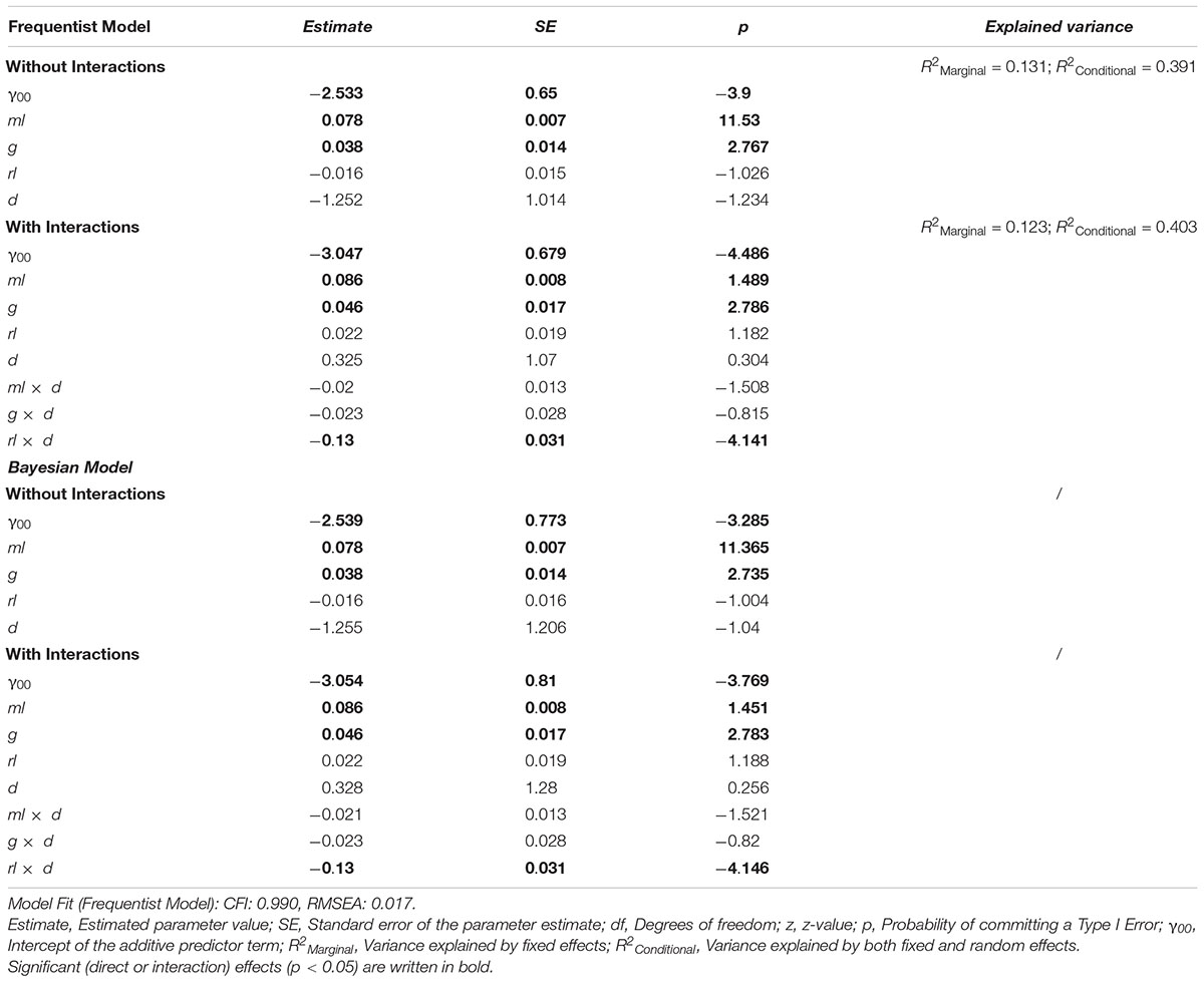 Predictiveness of different factors (i.e., ml, g, rl, and d) regarding the criterion cogIll in four different models (frequentist and Bayesian, both with and without interactions) without the Linda task.