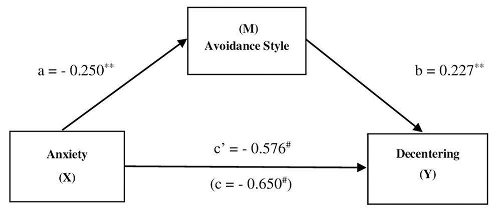 The mediating effect of Avoidance Style in the relationship between Anxiety and Decentering. **p < 0.01; #p < 0.001; all presented effects are standardized; a is effect of Anxiety on Avoidance Style; b is effect of Avoidance Style on Decentering; c' is direct effect of Anxiety on Decentering, c is total effect of Anxiety on Decentering.