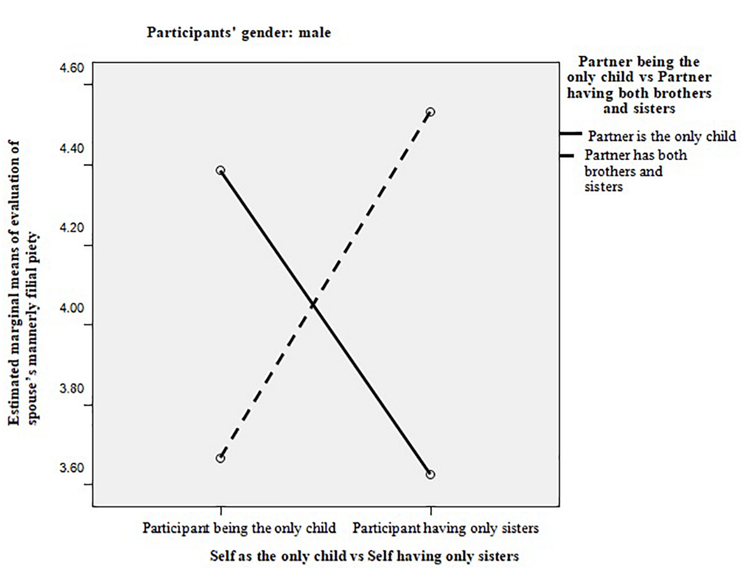 Independent t-tests were conducted six times, three for the participant’s self and three for the participant’s spouse, and the result is presented in Table 3. With one exception that husbands who had only sisters evaluated their spouse’s devoted filial behavior higher than those husbands who were the only child, the other significant differences were all based on the wife’s sibling condition. For male participants, compared to the condition when their wife was the only child, husbands’ expectation and evaluation of spouse’s filial piety were higher when their wife had brothers, regardless of whether she had only brothers or both brothers and sisters. For female participants, wives who were the only child had a significantly lower expectation and evaluation of their spouses’ filial piety than wives with other sibling conditions (having brothers or sisters or both).