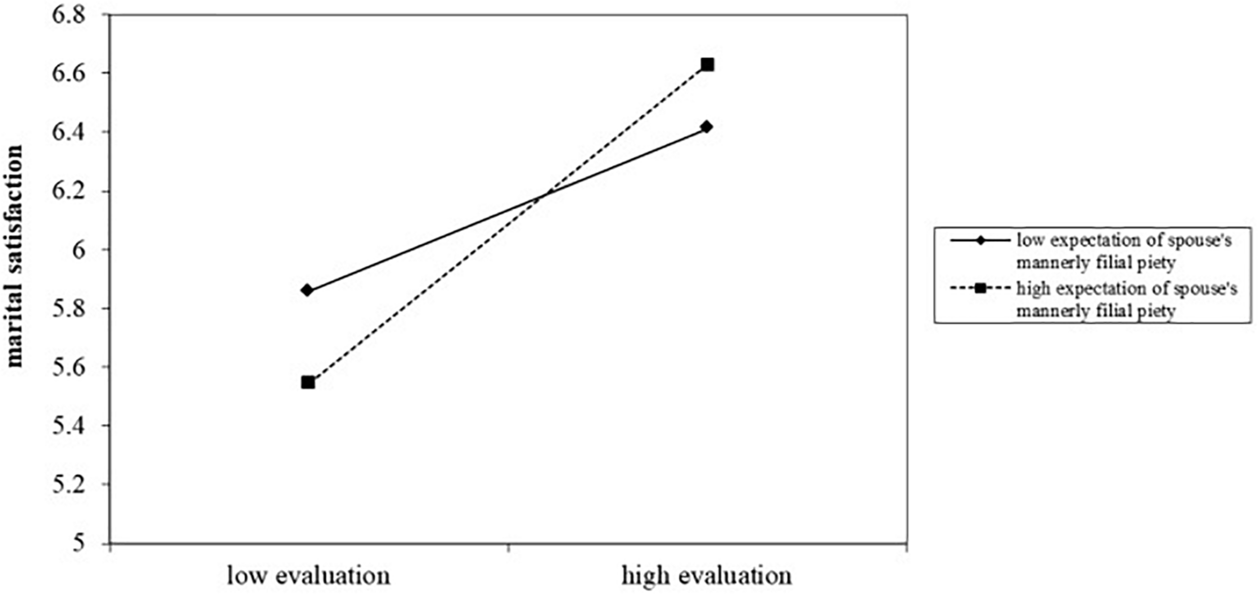 Hypothesis 3: Expectations of spouse’s filial piety moderate the relationship between evaluation of spouse’s filial piety and marital satisfaction. For those who have lower expectations, the evaluation of spouse’s filial piety has a small effect on marital satisfaction, while for those who have higher expectations, evaluation of spouse’s filial piety has a large effect on marital satisfaction.