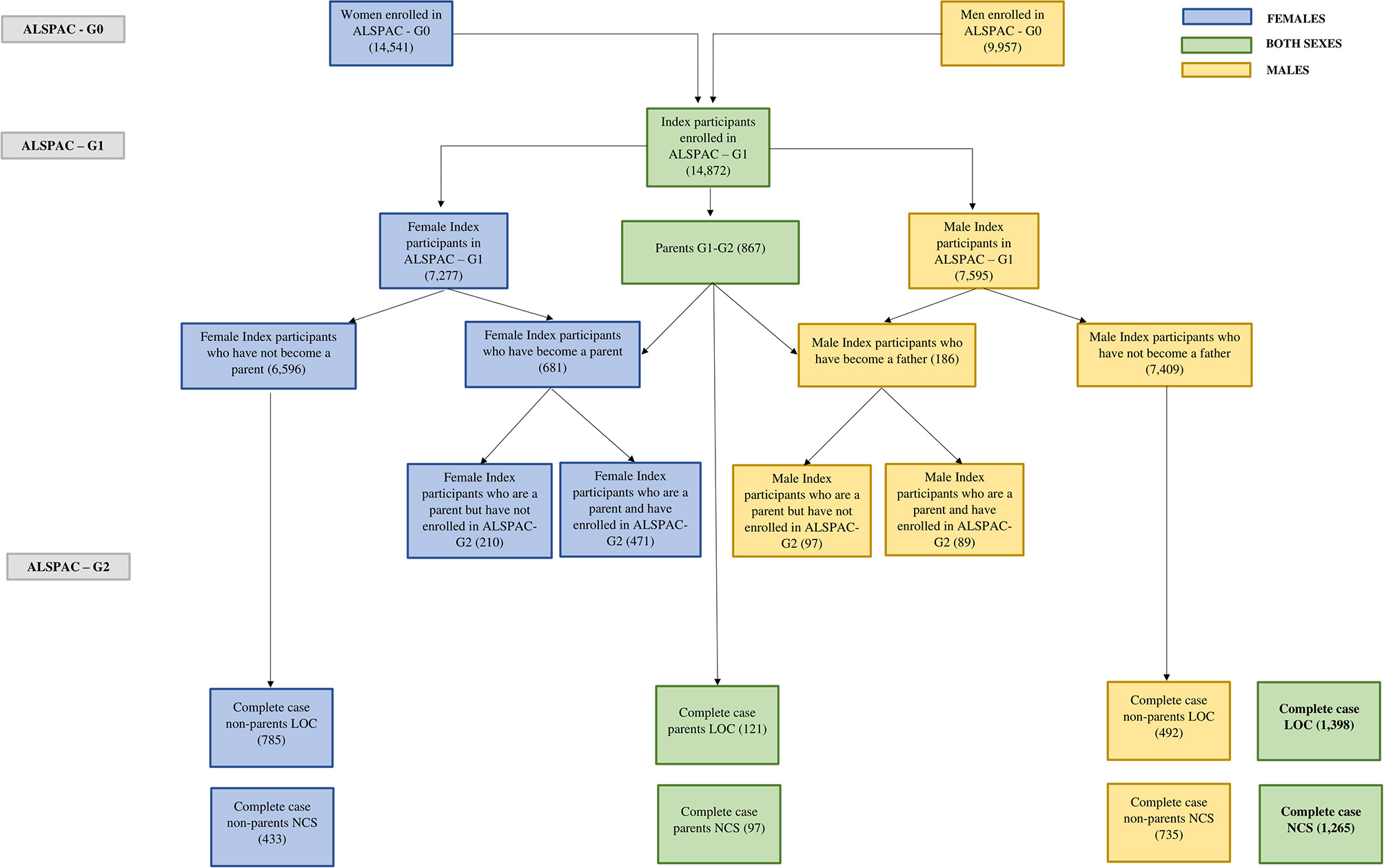 ALSPAC Flow. The present figure illustrates the sample included in our analyses (bottom rows of the graph) for both the LOC and NCS models. It describes the flow from the original mothers (ALSPAC-G0) recruited in the study up to the participants who had all the information needed to be eligible for our analysis. In the center of the figure we also illustrate how many ALSPAC-G1 participants are known to have become parents and how many have enrolled their children into the next ALSPAC generation (ALSPAC-G2). Different colors are used to distinguish between males and females. The legend of the colors is embedded in the figure.