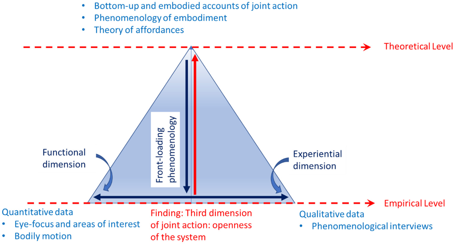 Diagram of the triangulation in the joint action experiment involving people with CP. The triangle depicts vertically the relations between the theoretical and empirical levels, and horizontally the relation between quantitative and qualitative data. At the theoretical level, the experiment was front-loaded by three main sources: (1) bottom-up and embodied accounts of joint action, (2) insights from the phenomenology of embodiment, and (3) the theory of affordances. At the empirical level, the relation between the functional and experiential dimensions is studied based on quantitative and qualitative data (horizontal blue arrow). From this analysis, an interpretation at the empirical level emerges, which suggests a different account of joint actions than the one offered by current theory (red vertical arrow).
