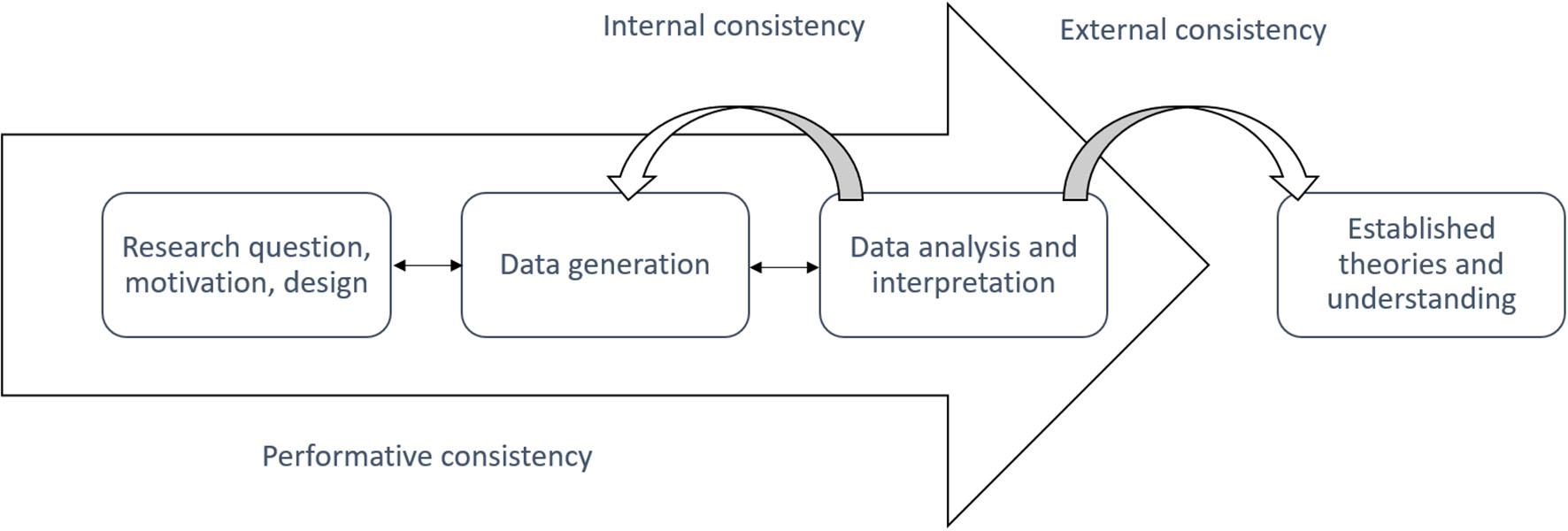 Applying these commitments, we wish to maintain the complexity and irreducibility of conscious experience and the interdependence or co-constitution of subjectivity and objectivity. As emphasized in principle 4, this is done by understanding the research process in phenomenological mixed method as a social practice that rests on the enacted and embodied observations, experiences, and expertise of the individual researchers, but which is developed into shared knowledge of a research community through an intersubjective sense-making process (Depraz et al., 2003; Gallagher and Zahavi, 2008; Martiny, 2017). In other words, the research process includes a group of researchers with different perspectives based in either first-person, qualitative or third-person, quantitative science. Both of these perspectives are embedded and contextualized by the second-person, intersubjective perspective of the community. The aim of phenomenological mixed methods is to meaningfully integrate these three perspectives in order to make sense of the data and (hopefully) answer the research question.