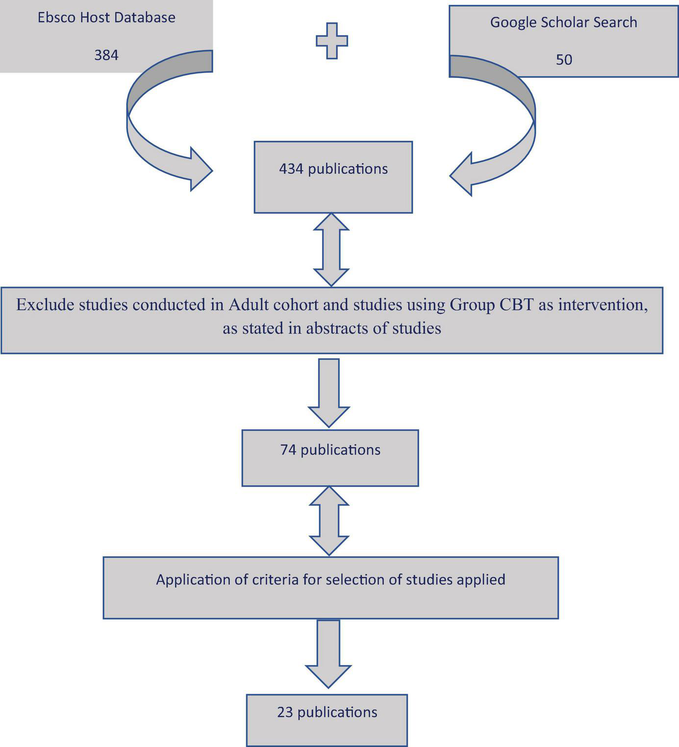 Google Scholar search was conducted using the same terms as in the EBSCOHost Research Database search and the first 50 results displayed by relevance were checked. Only two search results had not been figured in the EBSCOHost search, and these were added to the 432 results obtained from the EBSCOHost search for further review to check if they met the inclusion criteria.