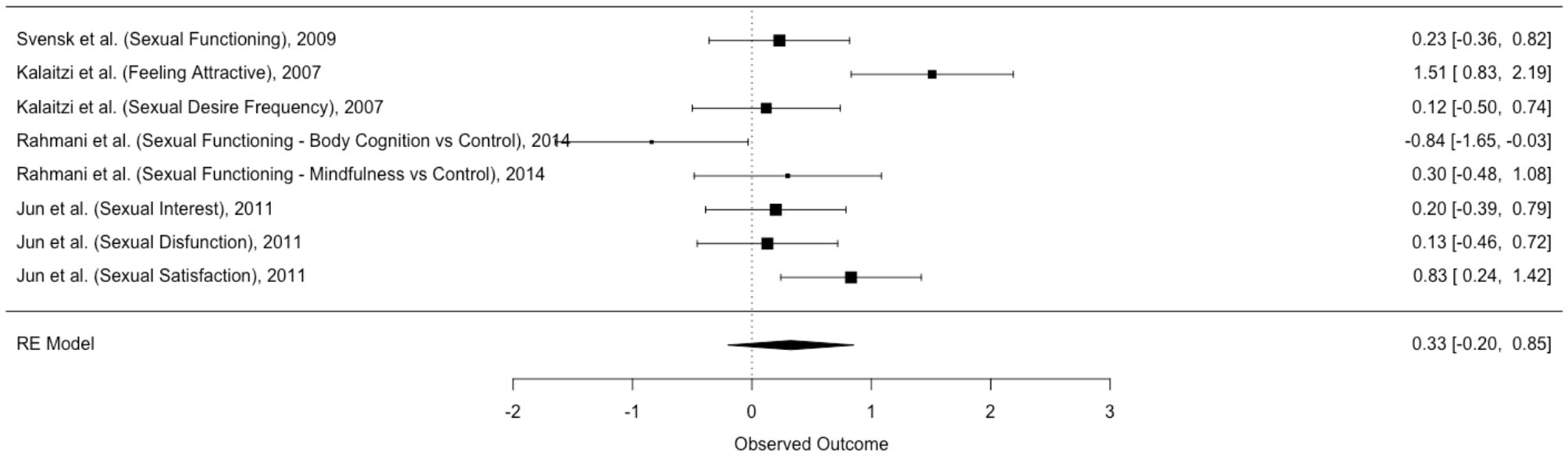 Outcome 1 includes six studies and nine dependent effect sizes on personal satisfaction with BI when naked or when dressed, BI distress, and BI appreciation. Outcome 2 includes four studies and eight dependent effect sizes related to sexual functioning, feeling attractive, sexual desire frequency, sexual interest, sexual dysfunction, and sexual satisfaction.