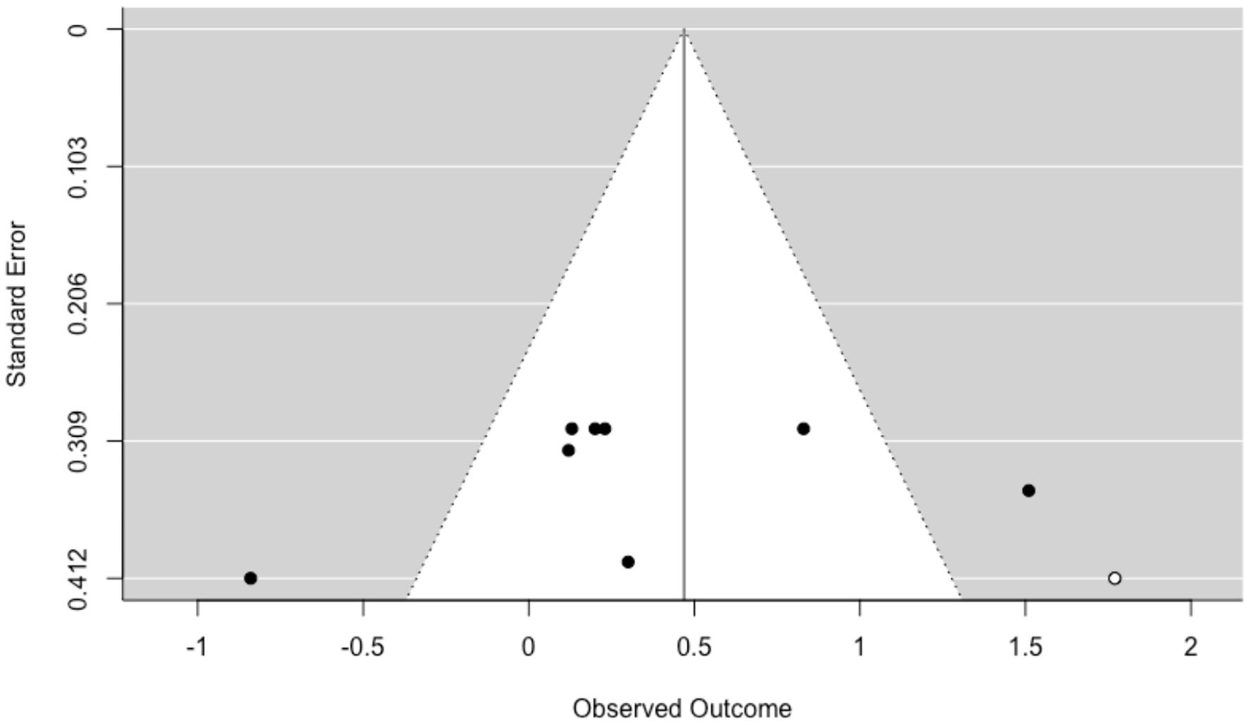 Publication bias was explored by inspecting the funnel plot graphs' asymmetry (Sterne and Egger, 2001) conducted with the trim-and-fill method and .rma function. If publication bias is absent, the funnel plot should assume a symmetric funnel shape. We also assessed whether small effects were underrepresented and whether large effects were missing (a great number of “missing” effect sizes suggested a bias to a greater extent; Assink et al., 2018) observing the white dots in the funnel plot (Higgins and Thompson, 2002).