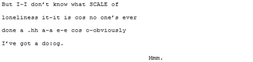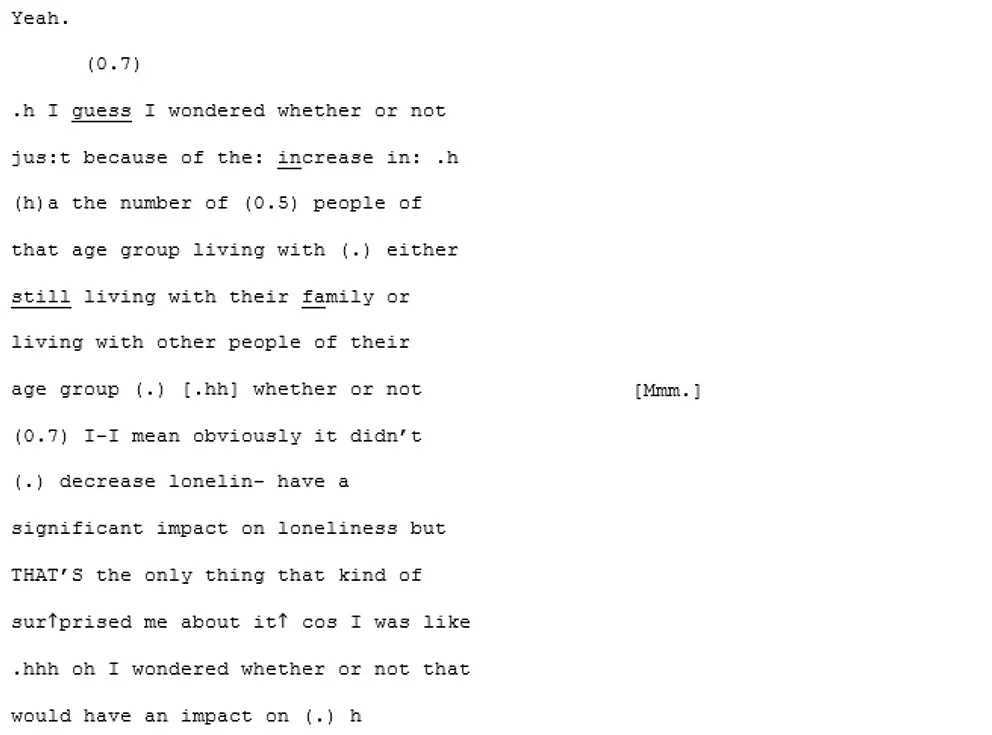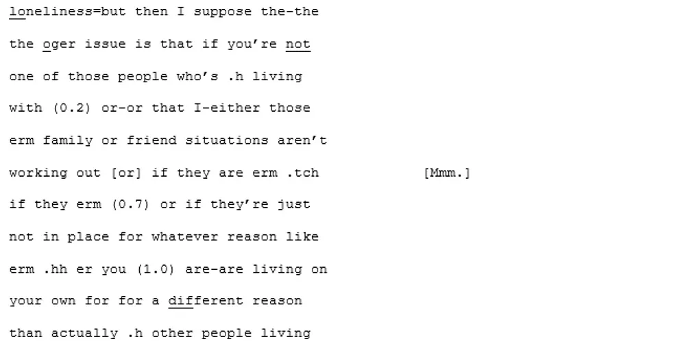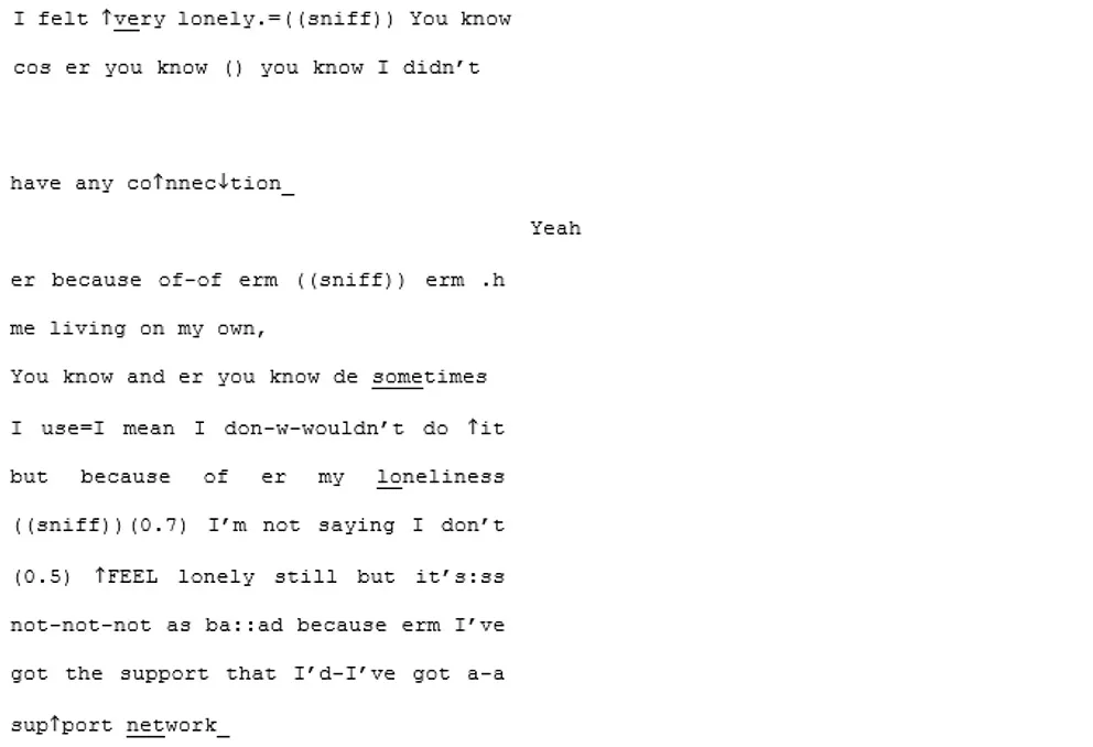 In the initial stage of the analysis, the transcripts were read through several times each in order to become familiar with the form and content of the conversations and the individual interlocutors. These first readings were undertaken within the Nvivo data analysis programme (QSR International Pty Ltd, 2020): software designed to assist in the management of qualitative datasets. Some initial codes were made representing emergent themes relating to the loneliness qualitative content, and stored for the planned secondary analysis to be completed later. In those cases where conversational characteristics were already becoming apparent, these were recorded as notes in the research log.