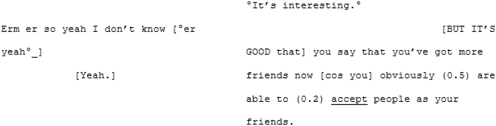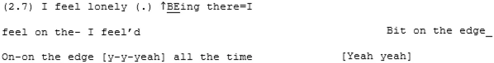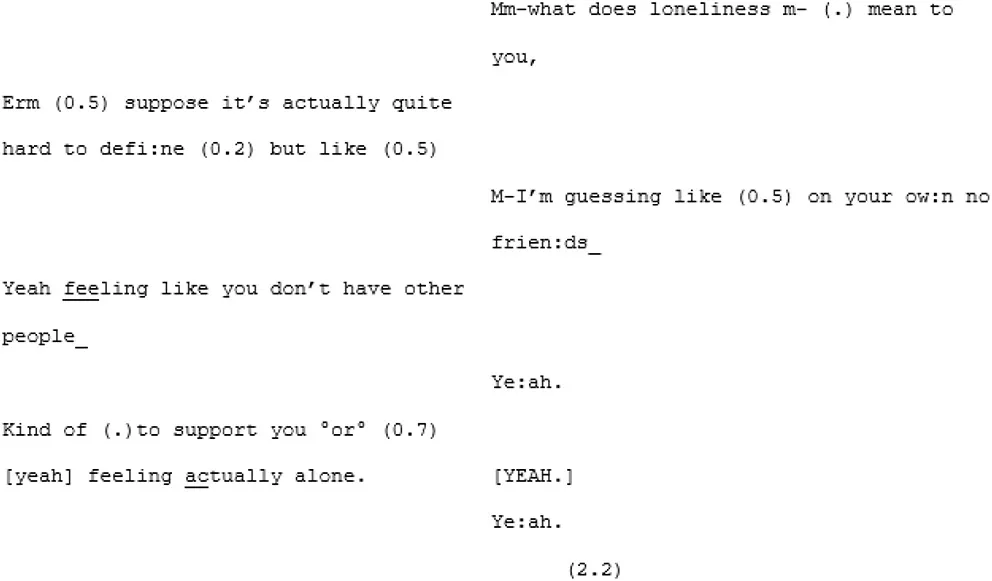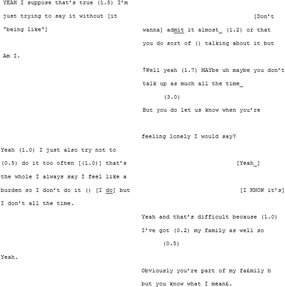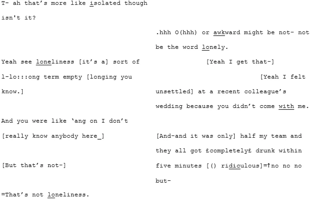 Their apparent difficulty in achieving mutual understanding is epitomized in the extract below where they struggle to understand what the other means, particularly around the definition of “loneliness.” A4 has repeatedly been saying that he doesn't “know what the word loneliness means” or what it “feels like”7. X4 seems to believe A4 just doesn't experience it as he doesn't need the company of others. From line 222 they fall into trying to define the concept of loneliness. X4 attempts to tell an anecdote describing a moment in which she felt lonely. A4 argues that what she is describing isn't “loneliness.” Suddenly the pace changes and where there was a balanced, measured exchange there are now rapid, over-lapping turns: